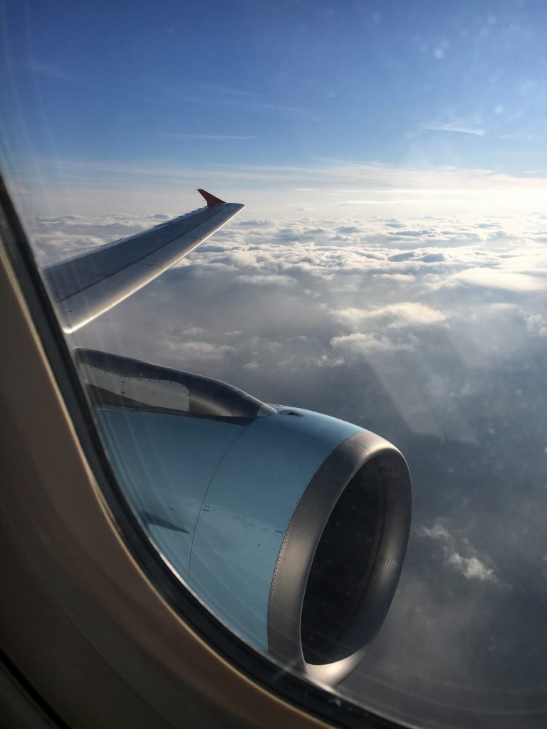 Nach 54 Stunden geht es mit dem Pyjama flight OS 606 um 6:25 zurück nach Wien. Der eine oder andere Sitznachbar dünstet wohl noch aus, es riecht nach einer durchzechten Nacht, sprich Alkohol, vermutlich Wodka?!