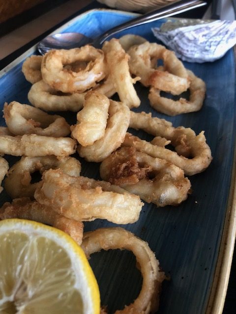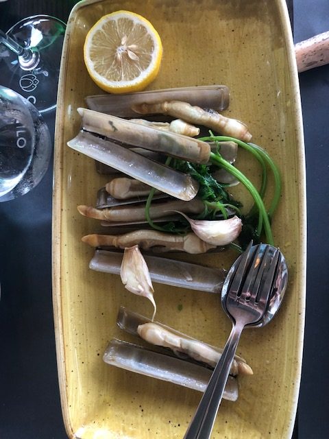 Auf der Rückfahrt ist das Restaurant Camilo der Lunchplace to be. Seafood natürlich und dass einfach gekocht, aber an Frische nicht zu überbieten. Selten gewordene rote Carabineiros, Seezunge oder Rotbarbe um nur einige Fische in der Auslage zu erwähnen, welche auf Eis liegen und vom Gast gezielt ausgewählt werden. Ein wenig Fachsimpeln mit dem Kellner und schon fällt die Wahl auf Pfahlmuscheln die leicht gedünstet werden, so zart und vollmundig daherkommen, einfach Natur pur! Der Blick schweift über das karge Grün der Küstenlandschaft, der Rose im Glas ist ein heimisches Gewächs, trocken ausgebaut und ein stilvoller Begleiter. Das Personal im Service, als auch in der Küche macht seinen Job unaufgeregt und souverän, tranquillo wie man so schön sagt, obwohl alle Tische belegt sind.