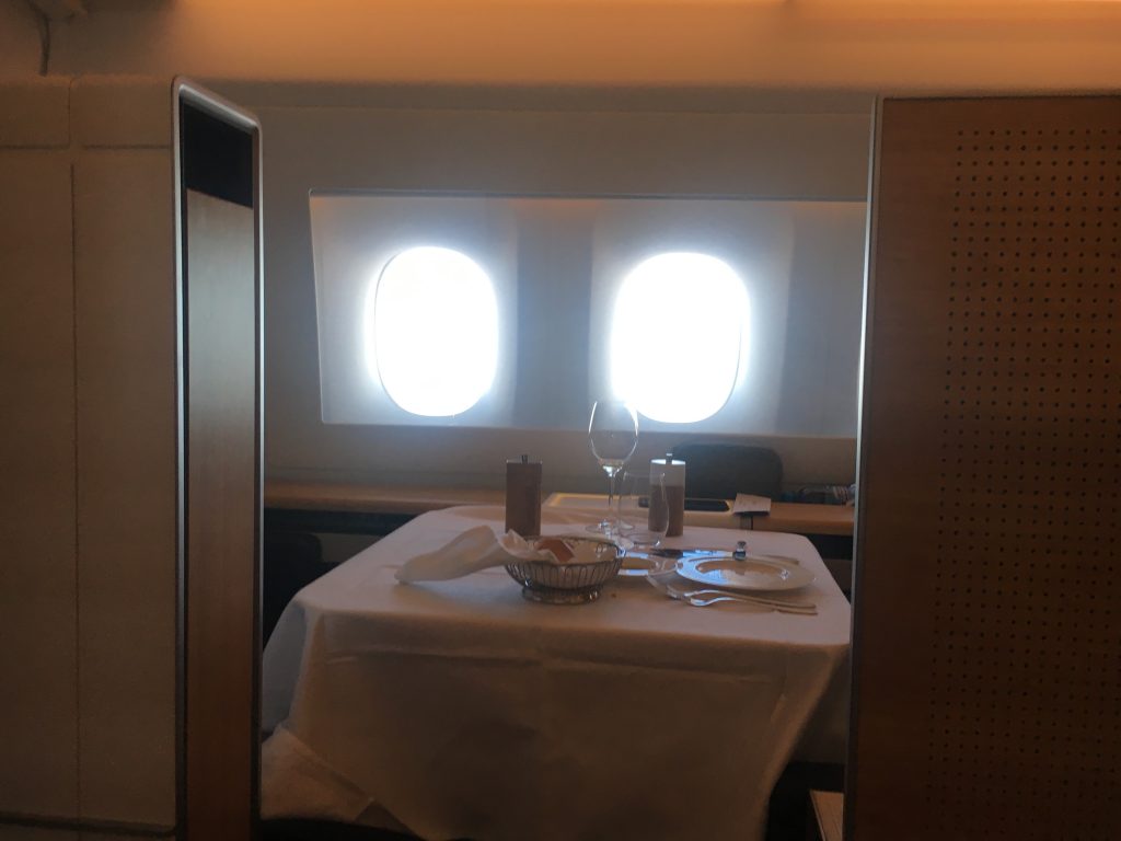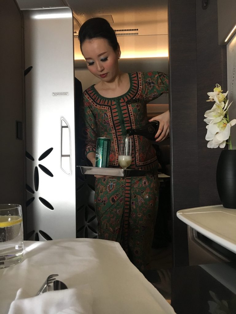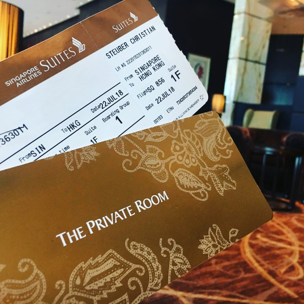 Nun zu einem der eigentlichen highlights dieser Reise – dem Flug nach Hongkong! Es gibt in Singapore einen eigenen First Class checkin, sowie die eigene Passkontrolle, dann geht es weiter mit einer speziellen Einladung in den „Private Room“. Dort angekommen wird ein guter Dom Perignon 2009 serviert, das Buffet bietet einiges an Abwechslung und die a la carte Küche über Mittag und am Abend zusätzliche Auswahl. In absehbarer Zeit soll die Lounge komplett renoviert werden, auf Anfrage der leitenden Managerin liefere ich meinen Input für ein noch Konsumenten freundlicheres F&B Konzept.