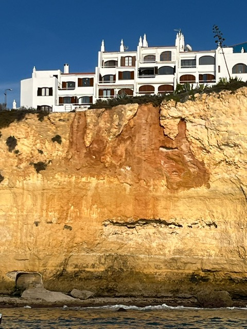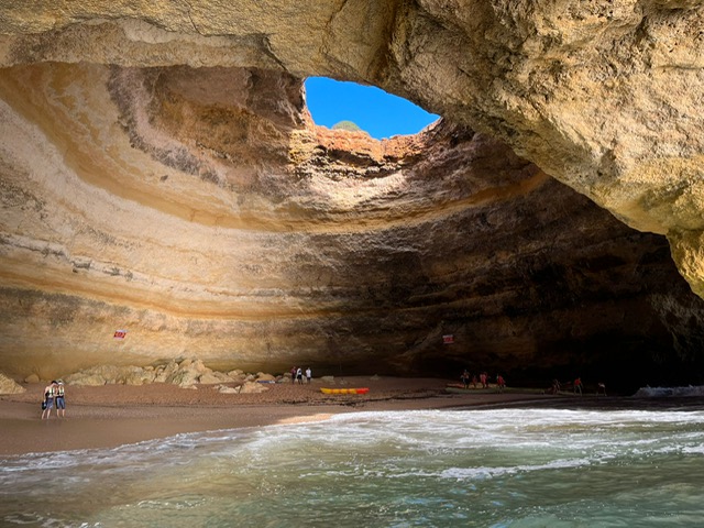 Man hat die Wahl zwischen verschiedenen Anbietern und unterschiedliche Fahrzeiten. Wir wählen, neben der 1,5 Stunden Tour, die einstündige. Als um 15:00 Uhr das kleine Boot mit Außenbordmotor startet, ist der Atlantik ruhig und glatt, dazu scheint die Sonne bei milden 22 Grad. Algar Seco ist der erste kurze Stopp, eine imposante Felsformation auf die man blickt, über Jahrtausende durch Wind und Wellen geformt. Weiter geht es über den Praia do Vale Covo bis zum highlight der Tour, dem Praia de Benagli. In dieser Höhle mit Strand, der nur mit dem Boot zu erreichen ist, ragt ein kreisförmiges Loch „an der Decke“, durch das man den strahlend blauen Himmel sieht. Da viele Touristen auf den Muschelkalkfelsen herumwandern, besteht auch die Gefahr abzustürzen, somit ist auch hier maximale Vorsicht geboten. Wer noch eine halbe Stunde länger unterwegs ist, fährt noch zur Felsformation am Praia da Marinha. Der Strand ist 5km von Carvoeiro entfernt und auch gut mit dem Auto zu erreichen. Das „hole in the rock“ Erlebnis ist absolut sehenswert und gleichzeitig schützen die bis zu 30m hohen Klippen die Schwimmer vor den hohen Wellen und dem hier manchmal stark blasenden Wind.