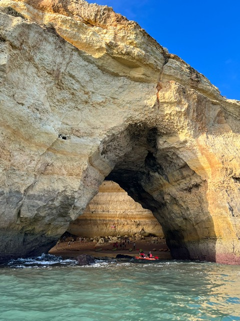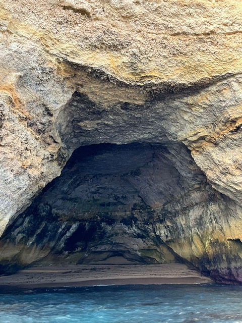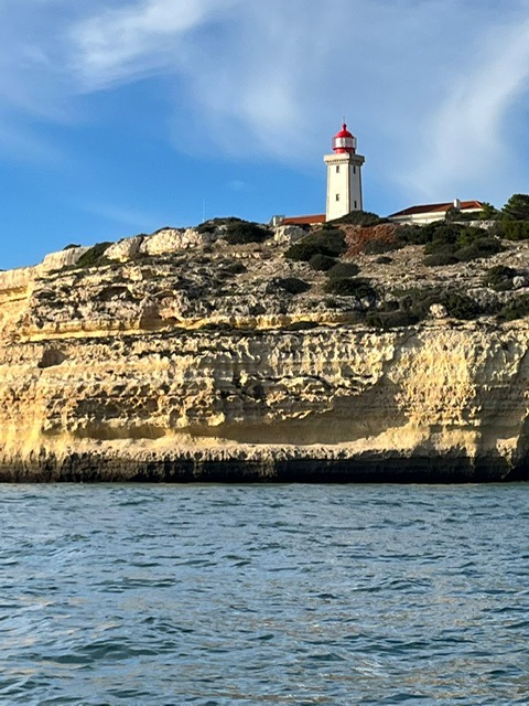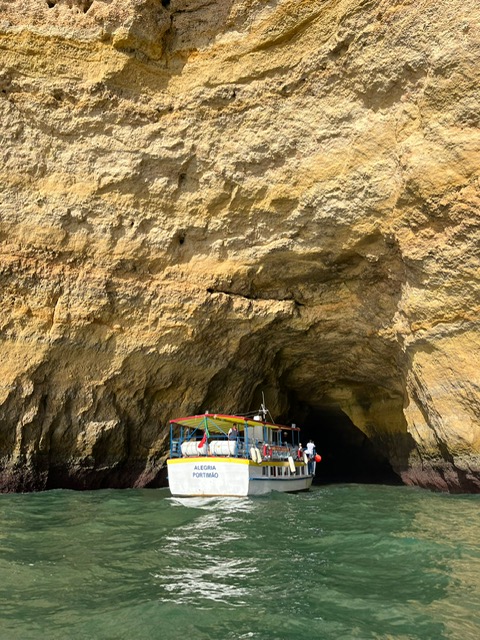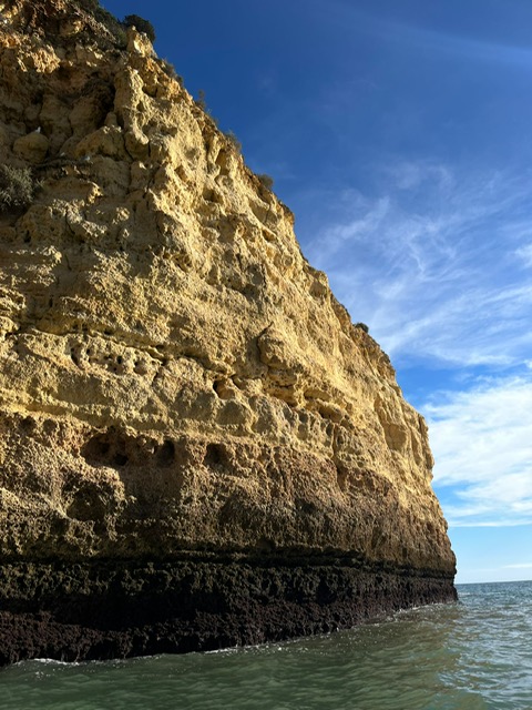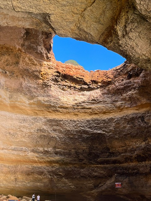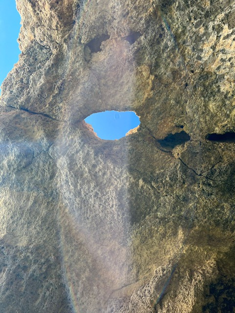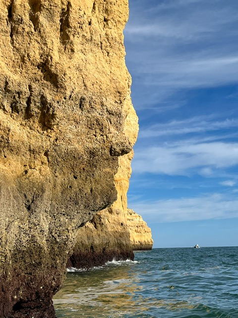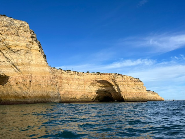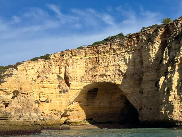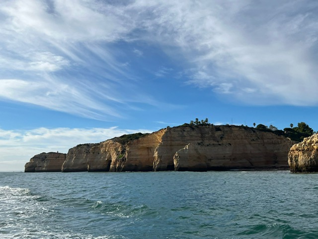 Man hat die Wahl zwischen verschiedenen Anbietern und unterschiedliche Fahrzeiten. Wir wählen, neben der 1,5 Stunden Tour, die einstündige. Als um 15:00 Uhr das kleine Boot mit Außenbordmotor startet, ist der Atlantik ruhig und glatt, dazu scheint die Sonne bei milden 22 Grad. Algar Seco ist der erste kurze Stopp, eine imposante Felsformation auf die man blickt, über Jahrtausende durch Wind und Wellen geformt. Weiter geht es über den Praia do Vale Covo bis zum highlight der Tour, dem Praia de Benagli. In dieser Höhle mit Strand, der nur mit dem Boot zu erreichen ist, ragt ein kreisförmiges Loch „an der Decke“, durch das man den strahlend blauen Himmel sieht. Da viele Touristen auf den Muschelkalkfelsen herumwandern, besteht auch die Gefahr abzustürzen, somit ist auch hier maximale Vorsicht geboten. Wer noch eine halbe Stunde länger unterwegs ist, fährt noch zur Felsformation am Praia da Marinha. Der Strand ist 5km von Carvoeiro entfernt und auch gut mit dem Auto zu erreichen. Das „hole in the rock“ Erlebnis ist absolut sehenswert und gleichzeitig schützen die bis zu 30m hohen Klippen die Schwimmer vor den hohen Wellen und dem hier manchmal stark blasenden Wind.