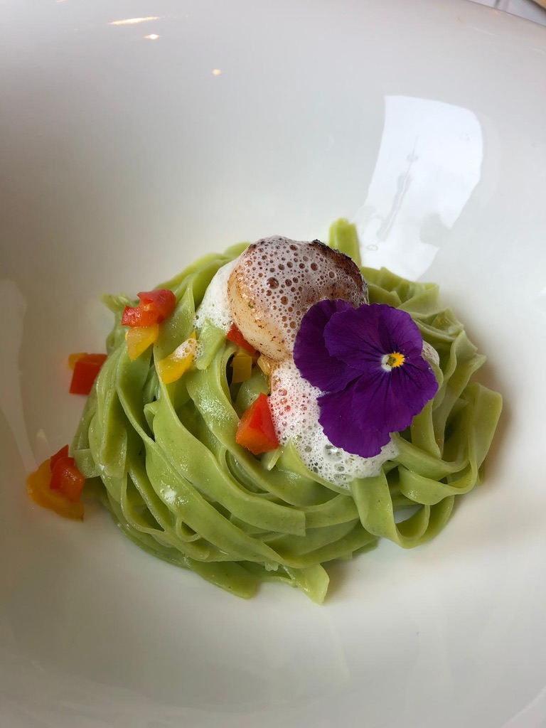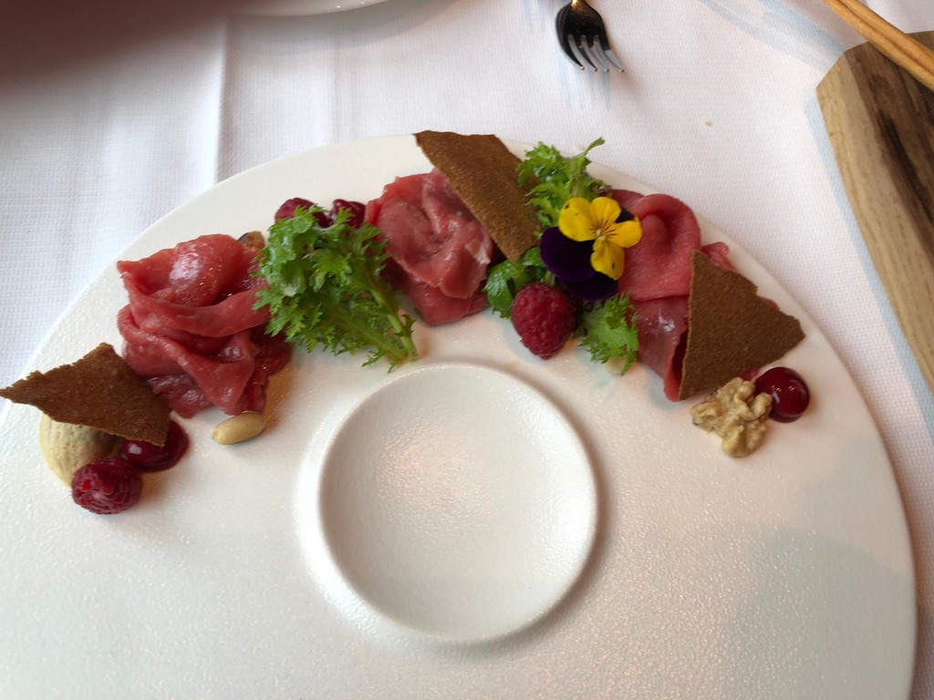 Am folgenden Tag sind die letzten Kilometer auf die Alm über den Fernpass und den Brenner kurzweilig. In Kastelruth, einem kleinen Bergdorf im Südtirol, genießen wir hervorragende Gastronomie im Hotel Lamm. Ein leckeres, frisch und somit etwas dicker aufgeschnittenes Ochsencarpaccio ist „Umami“ pur! Im Geschmack besticht es einmal anders durch die Säure der Himbeere anstatt der klassischen Zitrone. Als Hauptgang bestellen wir hausgemachte Bärlauch-Frischkäse Knödel angerichtet im look von Massimo Bottura´s  weltberühmten Gericht „….the chef dropped the lemoncake“. Meine Brennnesel-Tagliatelle findet sich leider nur farblich wieder und ist  mit einer Jakobsmuscheln garniert durchaus schmackhaft.