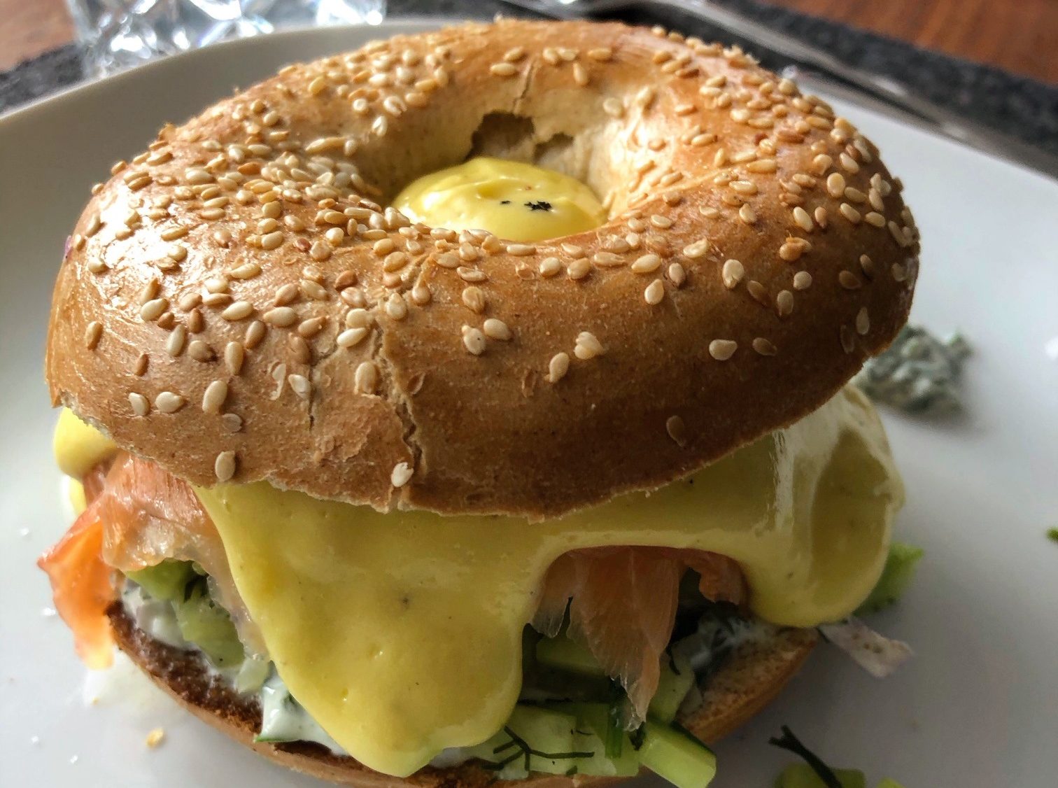 Den Bagel halbieren, toasten, mit etwas gebutterten Spinat belegen, die Eier auflegen, den Lachs hinzugeben und mit Hollandaise nappieren.