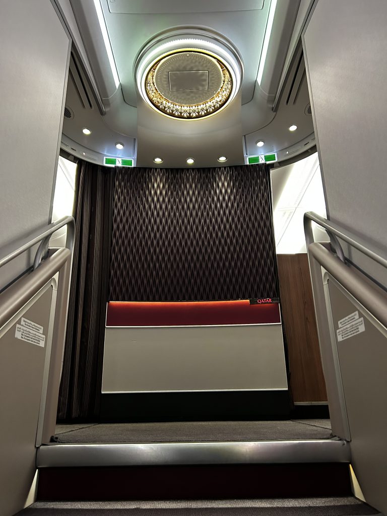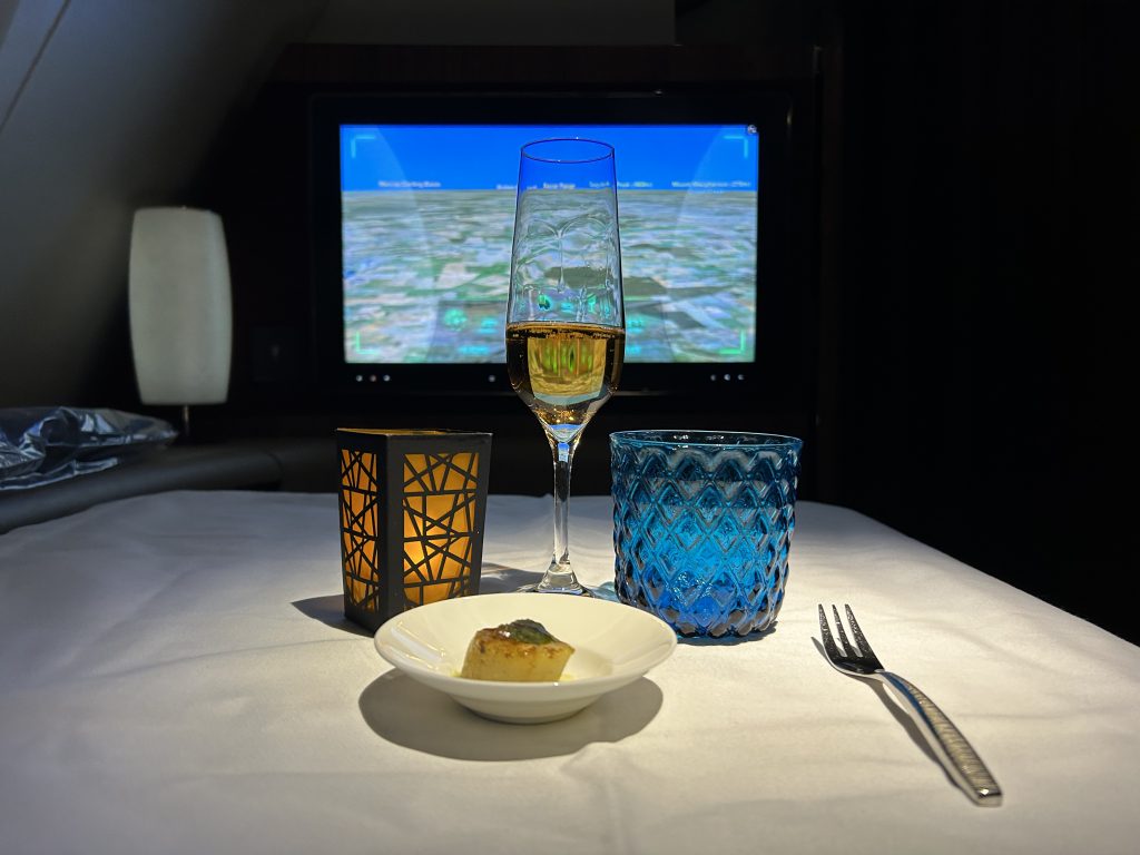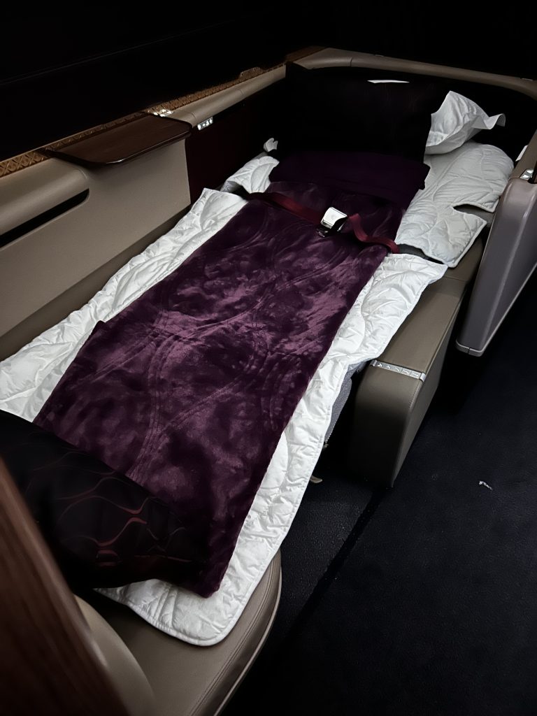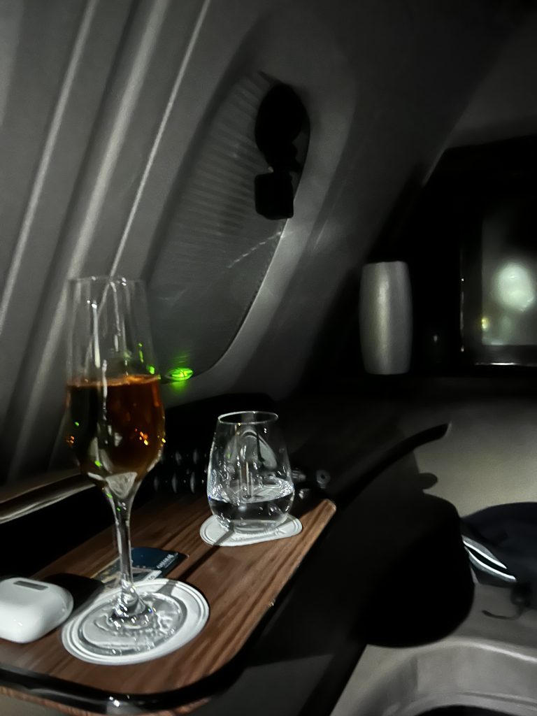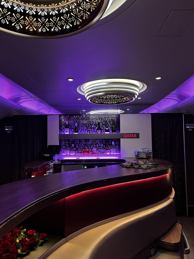 Im Anschluss ist Schlafenszeit! Es gibt einen Amenity Kid mit den nötigen Toilette Accessoires, einen Schlafanzug und ein paar Hausschuhe. Freundlicherweise wurde das Bett direkt im Nachbarsitz schon gemacht, da dieser nicht belegt ist. Eine gute Matratzenunterlage, eine warme Decke fördern den Tiefschlaf über australischen Küste. Die Flugroute führt weiter via Südindien und final über den Oman und die VAE. Zwischendrin vertreibt man sich die Zeit an der immer noch hyper-stylischen Bar, vielleicht der schönsten Bar in the Sky!? Hier werden neben kleinen Snacks in Gläsern, zum Beispiel rohen Thunfisch, auch die entsprechenden Weine und Cocktails serviert. Ein Barkeeper hat „Schicht“ und ist freundlich, gesprächig und immer hilfsbereit zur Stelle. Da es ein Nachtflug ist halten sich hier maximal 4-6 Personen auf, was in der großzügigen Location immer noch viel Platz für jeden bietet.