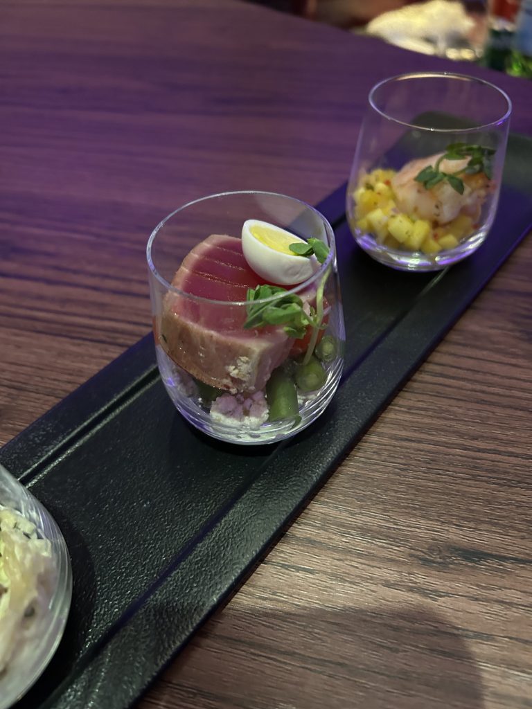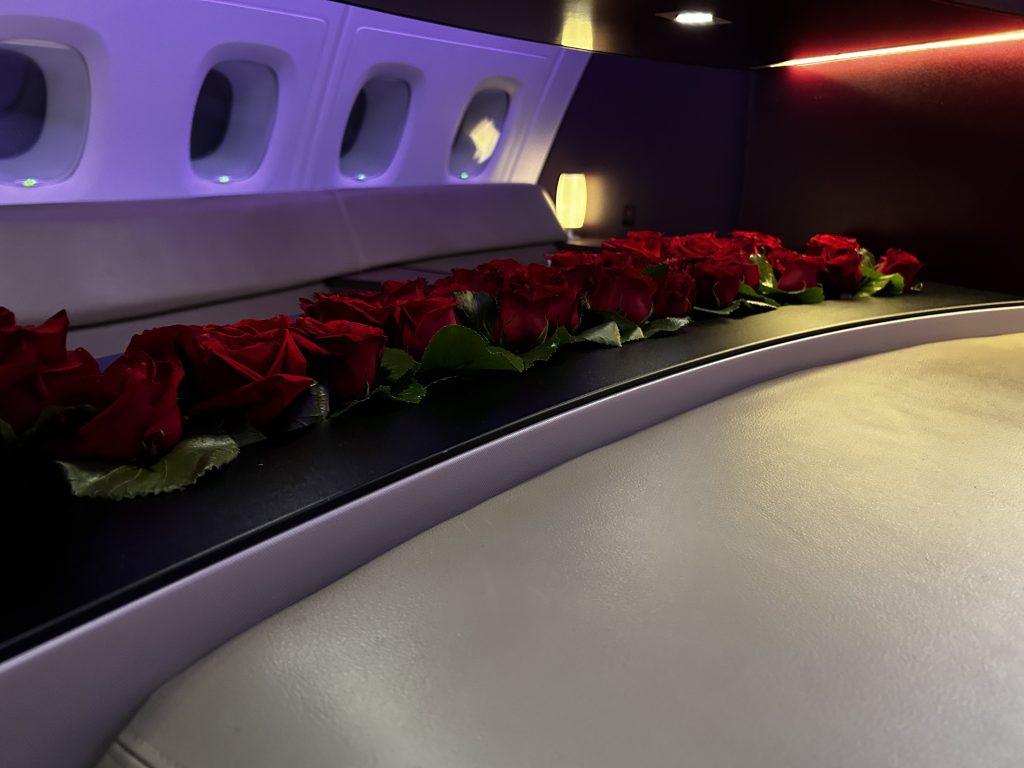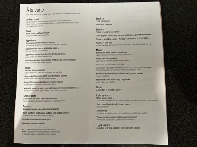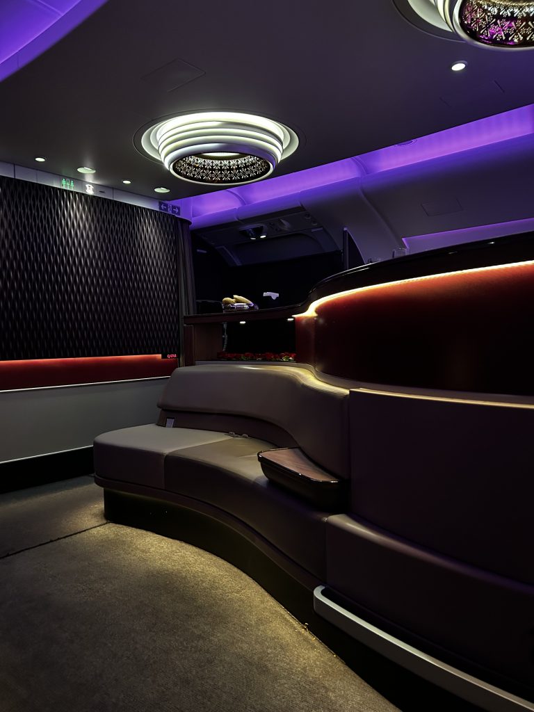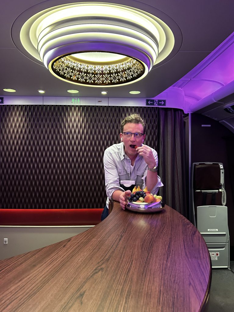 Im Anschluss ist Schlafenszeit! Es gibt einen Amenity Kid mit den nötigen Toilette Accessoires, einen Schlafanzug und ein paar Hausschuhe. Freundlicherweise wurde das Bett direkt im Nachbarsitz schon gemacht, da dieser nicht belegt ist. Eine gute Matratzenunterlage, eine warme Decke fördern den Tiefschlaf über australischen Küste. Die Flugroute führt weiter via Südindien und final über den Oman und die VAE. Zwischendrin vertreibt man sich die Zeit an der immer noch hyper-stylischen Bar, vielleicht der schönsten Bar in the Sky!? Hier werden neben kleinen Snacks in Gläsern, zum Beispiel rohen Thunfisch, auch die entsprechenden Weine und Cocktails serviert. Ein Barkeeper hat „Schicht“ und ist freundlich, gesprächig und immer hilfsbereit zur Stelle. Da es ein Nachtflug ist halten sich hier maximal 4-6 Personen auf, was in der großzügigen Location immer noch viel Platz für jeden bietet.