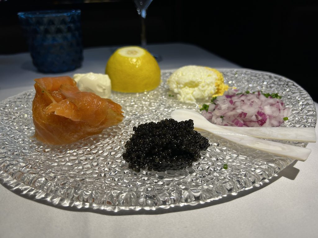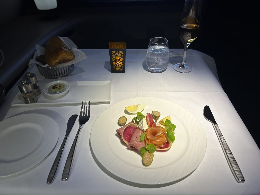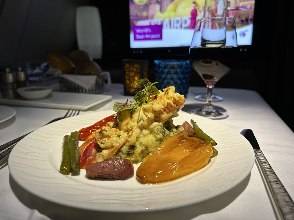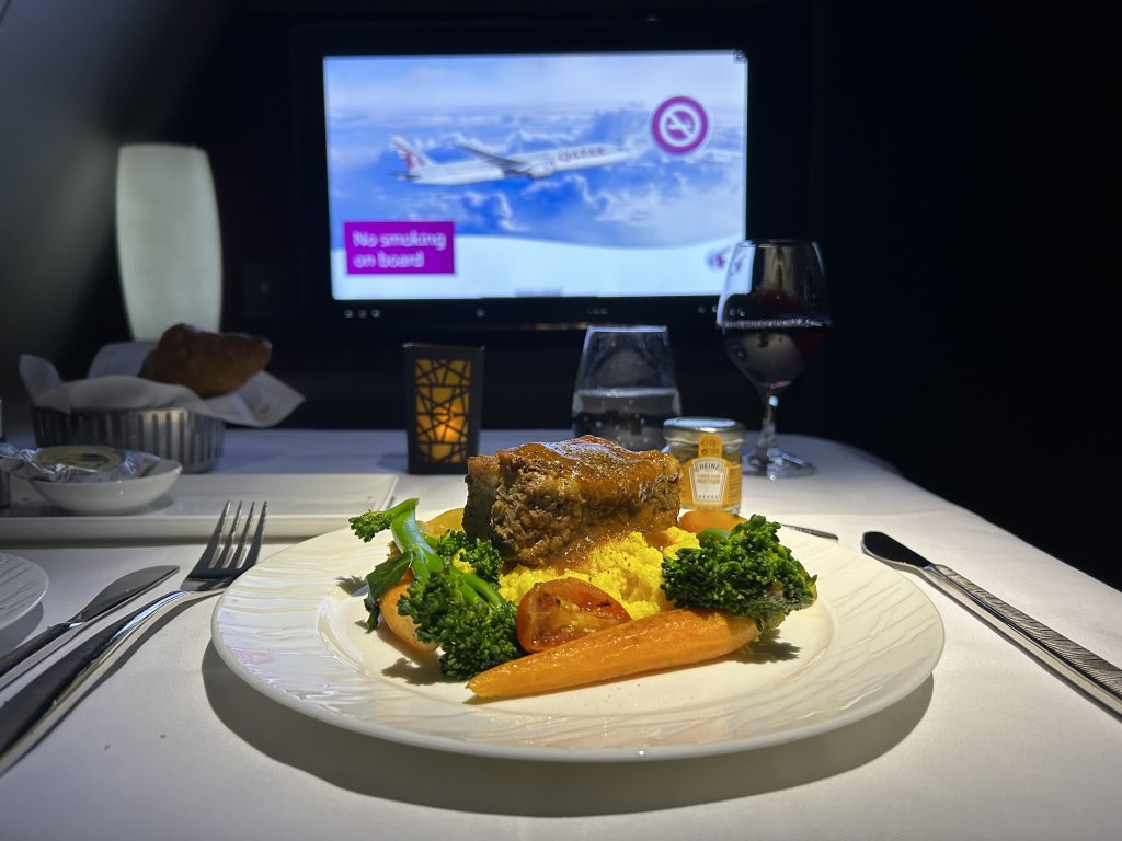 Kommen wir zum Produkt! Was bei Qatar geboten wird ist Weltklasse um es vorwegzunehmen. Da ist zum Start einmal der Sitz der unter anderem auch bei Air France so im Einsatz ist. Dieser lässt sich in ein 2,30 m flaches Bett ausfahren, was guten Schlaf und Platz garantiert. Auf dem A 380 sind  517 Sitze verbaut,  461 in der Economy, 48 in der Business und nur 8 Stück in First. Dieser Sitz ist mit einer hochfahrbaren Wand ausgestattet, um die Privatsphäre zu garantieren. Der Empfang an der Flugzeugtür ist professionell und es folgt die Begleitung zum Platz. Die Unterstützung beim verstauen des Gepäcks ist sehr willkommen, es gibt keine overhead-locker und sobald man Platz genommen hat, werden warme Nüsse gereicht und ein Aperitif. Die Wahl fällt auf ein den 2007 Jahrgangs-Champagner „Rare“ aus dem Hause Piper-Heidsieck. Dieser soll nach tropischen Früchten, weißer Schokolade und etwas Honig schmecken, was ich allerdings nur in Teilen so bestätigen kann. Der 2.Champagner an Bord ist ein Rose aus dem Hause Laurent-Perrier, Cuvée Alexandra 2006. Beide Weine sind für ein solch positioniertes Produkt wie die First Class absolut angemessen. Da schmuggeln sich andere Airlines, ohne den Lokalmatador zu erwähnen, mit wesentlich simpleren Produkten durch den Alltag. Was übrigens auch für die den Rest der Wein- und Menükarte gilt. Wer möchte genießt auch einen Schluck Arabic-Coffee, welcher mir auf Grund der späten Zeit, es ist 21:30, doch nicht so gelegen kommt. Allerdings gehört er zum festen Bestandteil und der Kultur der Qataris. Da der Champagner gerade im Ausschank ist, wähle ich nach dem Start den Osietra Kaviar, welcher mit seiner leicht salzigen, nussigen Note vollends überzeugt. Die Verpackung verrät und zu meiner Überraschung, dass dieser aus Russland kommt. Der Markt scheint nur noch den Qataris zugänglich, auf Grund der aktuellen politischen Lage und des Embargos. Das Mezze lasse ich aus und probiere die australischen Tiger Prawns, die Jakobsmuschel und den Tunfisch auf asiatischen Pilzen-#yum! Dazu passt ausgezeichnet der Chablis Grand Cru aus der Domaine William Fevre. 100% Chardonnay mit feiner eleganter Holznote, dazu noch in Bioqualität – Weltklasse again! Auf einem 14 Stunden Flug kann man sicherlich mehr probieren, somit folgt die Bestellung und die Wahl fällt auf dem Hummer Thermidor, ein Klassiker. Hierbei wird das Hummerschwanzfleisch in der Schale leicht cremig und flambiert serviert. Die Portion ist übersichtlich, weniger ist halt mehr. Einige Stunden später geht das Messer wie Butter durch das zarte Tasmanische Rindfleisch, welches sous-vide gegart wurde. Als Sättigung kommt eine cremige Polenta feinkörnig daher, was eine schöne und niemals zu trockene Angelegenheit wird. Was mir wirklich bei Qatar imponiert ist, dass alle Gericht wirklich schön und akkurat angerichtet werden! Das ist kein Vergleich zu so manchen Wettbewerb und hinterlässt nachhaltig einen positiven Eindruck. Zu Rindfleisch passt immer noch gut ein Rotwein. Und jetzt sind wir wieder in der First Class, denn es wird ein Biondi Santi DOCG 2011 gereicht. Dieses Weingut ist eine Legende in der Toskana und der Saft wird aus 100% der Sangiovese hergestellt-nochmal Weltklasse. Da es nicht bei einem Rotwein im Angebot bleibt, ist eine Degustation des Bordeaux, nämlich des Chateau Ducru-Beaucaillou, aus der Region Saint-Julien nötig. Er ist ein Grand Cru aus dem Jahre 2008 der viel Charakter aber auch Finesse zeigt. Sein Mischsatz besteht aus 70% Cabernet Sauvignon und 30% Merlot, welcher ihm hilft, die Tannine etwas auszugleichen. Der dritte rote im Bunde kommt aus Australien, der Ares und wurde im Jahre 2014 gekeltert. Allerdings gilt für alle Rotweine, sie sind bei weitem zu kühl serviert und können nur schwer ihre Aromatik entfalten. Nach 4 Stunden Flug sieht das mit der Temperatur definitiv besser aus! Zum Dessert, welches ich auslasse, bietet Qatar Chateau Rieussec 2010, also ein Sauternes sowie ein 20 Jahre alter Tawny Port an. Zusätzlich finden sich 3 Biersorten, 9 Cocktails 2 Cognac´s und so einige Gin´s in der Getränkekarte. Das Angebot gehört nach meiner Einschätzung zu den Top 5 in der Welt, in Europa kann vielleicht noch Air France mit der La Première mithalten.
