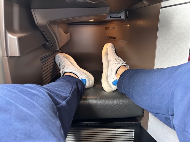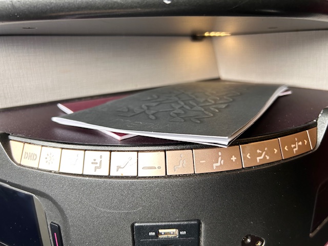 Das Entertainment Angebot kommt auf diesem Ultra-Langstreckenflug in seiner Nutzung zu kurz, dass liegt unter anderem daran das von 17 Stunden, 10 im Schlaf verbracht werden. Dafür fährt man den Sitz komplett flach, die Flugbegleiterinnen legen eine dünne Matratze auf und es gibt dazu von der Airline einen Schlafanzug, sowie eine sehr hochwertige Decke. Der am Platz befindliche Kulturbeutel hält alles bereit was man braucht, bevor es ins Bett geht. Mit Augenklappe und Ohrstöpseln ist es sehr ruhig, mit der geschlossenen Tür zudem sehr privat. Das liegt auch am Model, dem A 350-1000, einem der leisesten Flugzeuge am Himmel.