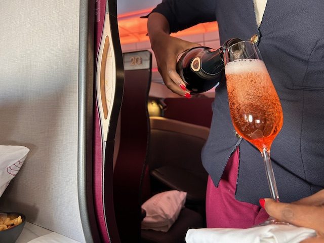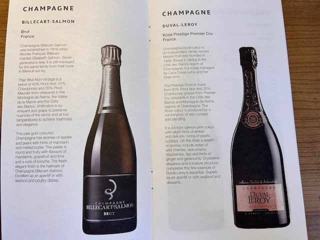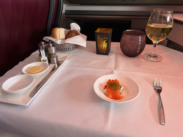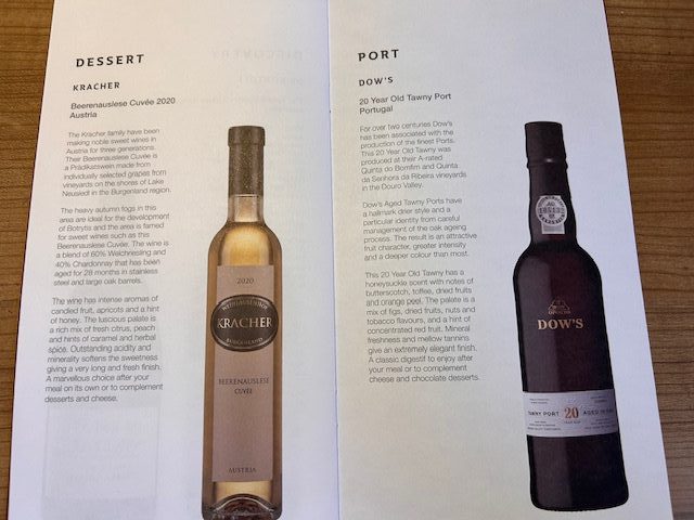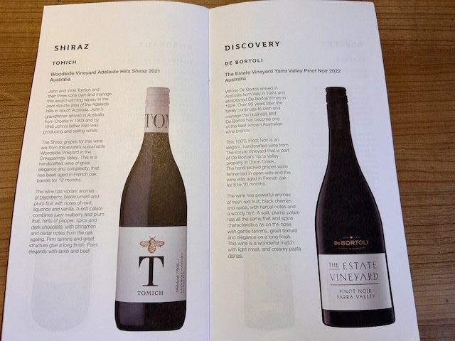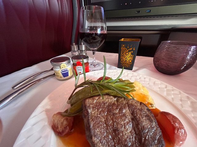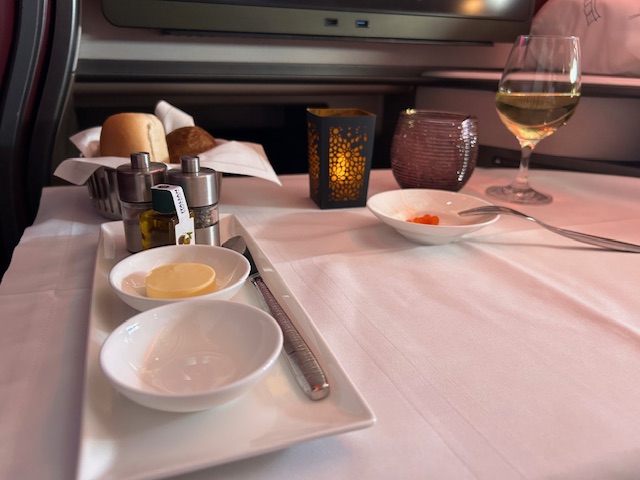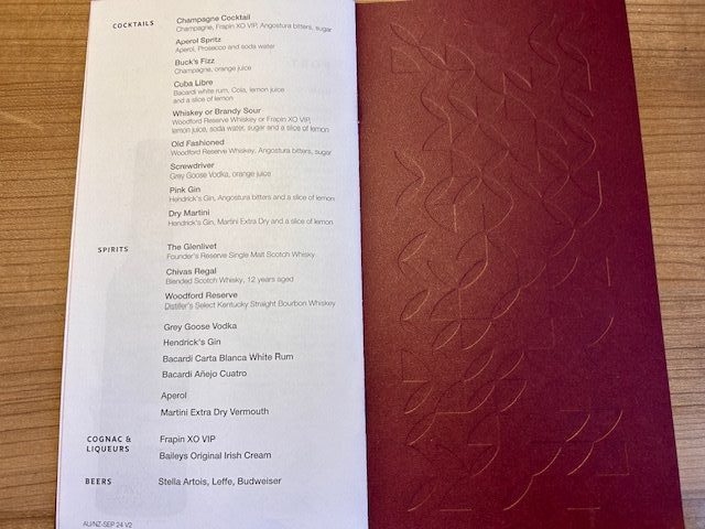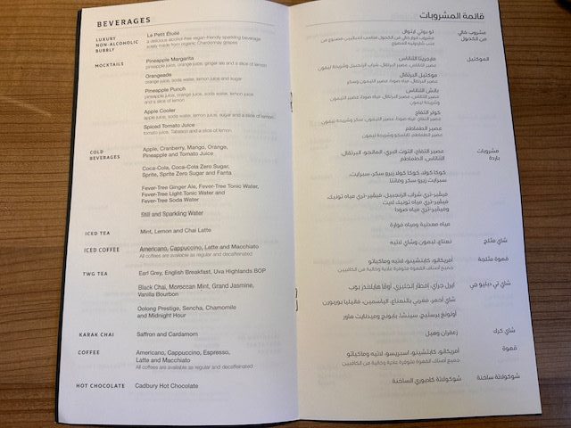 Nach dem Start zum Priority Boarding erfolgt an der Tür eine freundliche Begrüßung und man wird an den Sitz begleitet. Sobald man sich dort eingerichtet hat bringt der Service ein Glas französischen Schaumwein oder einen arabischen Tee, sowie ein heißes Tuch. Direkt im Anschluss bekommt der Gast die Speise- und Getränkekarte überreicht, die Abfrage erfolgt noch am Boden was man nach dem Start gerne trinken möchte. Wenn es schonmal um den flüssigen Genuss geht, die Weinkarte kann sich sehen lassen. 2 Champagner zur Wahl sind ein sehr guter Auftakt und dies ist in Business Class eine Ansage! Billecart-Salmon und der Rose aus dem Hause Duval-Leroy, welcher mit schönen Himbeernoten daherkommt, sind oberes Regal. Ein Chardonnay aus Australien vom Weltkonzern Penfolds mit dem Etikett Bin 311, datiert aus dem Jahr 2017 – ebenfalls nice! Wer sich mit Wein im Airline Business beschäftigt der weiß, dieser 7 Jahre alte Tropfen hatte Zeit zu reifen und ist hier oben eher eine Rarität, wenn es um Weissweine geht. Das merkt man ihm auch an, der Rebensaft ist eine Liason mit 8 Monaten Lagerung im Holzfass. 2 weitere Weissweine, ein Riesling und ein Sauvignon Blanc komplementieren das Angebot. Wer lieber Rotwein wählt der entscheidet sich zwischen einem Bordeaux, Chateau Pédesclaux, ein Grand Cru aus dem hervorragenden Jahr 2015. Der Shiraz vom Weingut Tomich und ein Pinot Noir 2022 aus Australien, runden das sehr gute Weinangebot ab.