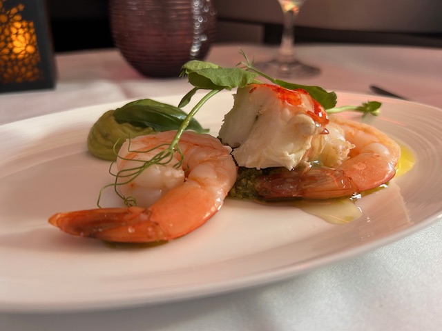 Bei der Vorspeise wählt man aus 3 verschiedenen Offerten. Der Hummer mit Garnelen, Avocado Püree und Yuzu kombiniert, ist eine Delikatesse. Eine Kreation die nicht nur perfekt zu den Weißweinen passt, hier kennt sich jemand im Menu Management aus! Zusätzlich sind 4 verschiedenen Hauptgänge hinterlegt, alle werden a la minute auf Porzellan angerichtet und sind von viel Produktqualität geprägt. Relativ langweilig dagegen fällt meine Wahl auf das Rinderfilet mit Thymian Jus, welches verhältnismässig trocken den Weg an den Platz findet. Die Saucen aus dem Hause Heinz retten ein wenig die Moisture und Texture. Für all diejenigen die einen süßen Abschluss suchen steht ein Schokoladen Fondant, Beeren mit Rosenwasser und eine Eiscreme Variation bereit.