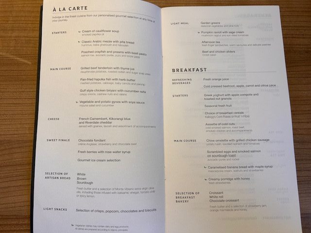 Das Frühstück unterteilt sich ebenfalls in mehrere Gänge aus Vorspeise, Hauptgang und Dessert. Das alleine ist schon ein sehr gutes und hohes Niveau, welches nur selten über den Wolken bei anderen Anbieter anzutreffen ist.
