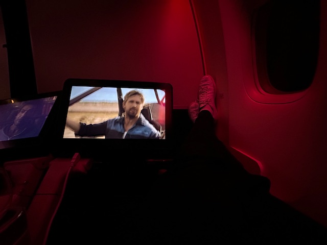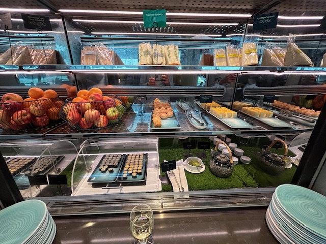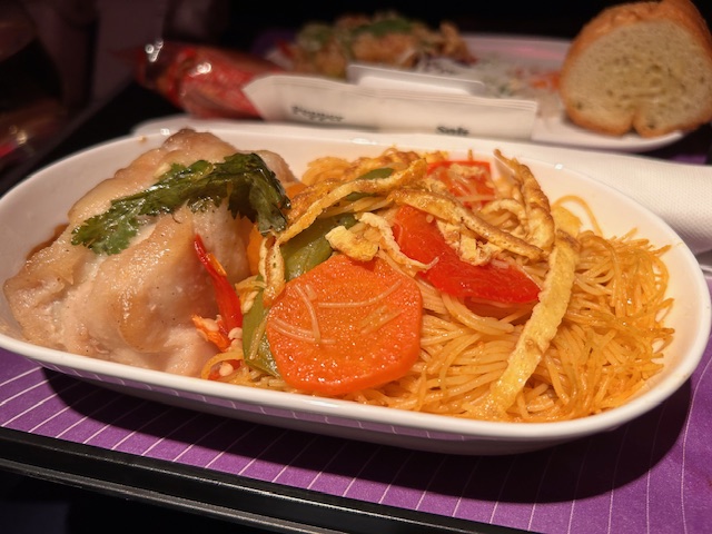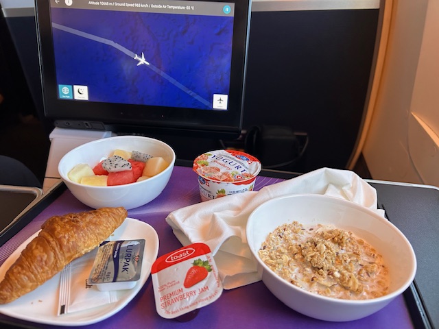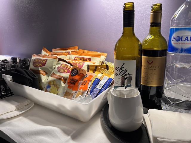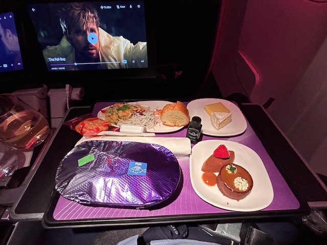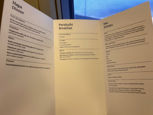 Die Getränkekarte ist nicht grossartig spezifiziert wenn es um die Marken geht. Das bringt die Flexibilität mit anzubieten was ggf. gerade auch am Markt günstig zu bekommen ist. Es tut der Qualität keinen Abruch, die Wine Selection bietet zuverlässig gute Qualitäten an neuseeländischen Traubensäften. Die Reben von Sauvignon Blanc, Chardonnay bis Merlot zum Beispiel aus dem Esk Valley oder dem global Player Villa Maria sind ein leckerer Essensbegleiter und werden in einem bauchigen Glas serviert.(bei anderen Anbietern oft auch nur Plastik) Beim Abendessen fällt die Wahl auf den Grouper (Fisch) mit Singapore Nudeln und Chili. Das Fischfilet ist hochwertig, der Grouper gehört zu den Barschen und es ist ein schackhaftes Essen das im Porzellangeschirr überreicht wird. Der 2. Hautgang wäre ein asiatisches Hühnchen-Gericht mit Reis, Pak Choi und ebenfalls Chili die Alternative. Ja und es gibt sogar ein Essen Nummer 3 das Rindfleisch Brisket, mit getrüffelten Nudeln und gerösteten Zucchini. Ohne die Vorspeise zu vergessen, hier ist lediglich eine im Angebot und diese besteht aus gezupften Königskrabben Fleisch und Vermicelli Nudeln, sowie frischen Koriander – einfach lecker! Das Dessert ist eine karamelisierte Mandel Tarte mit Kaffeemouse und Himbeere, brutal lecker und im Mund schmelzend – absolut zum Niederknien. Kurz vor der Landung offeriert die Crew das klassische Kontinental-Breakfast und wer möchte bestellt sich entweder ein Kräuteromlette, gewockte Reisnudeln oder Pfannkuchen mit Kokosnuss und Ananas als warmes Gericht.