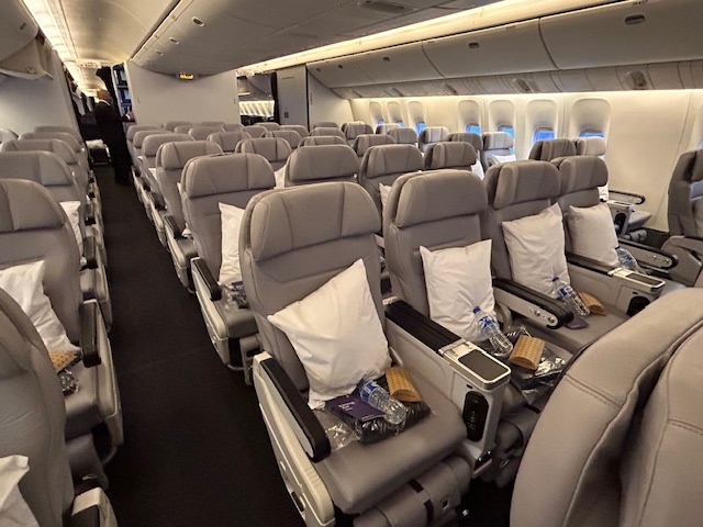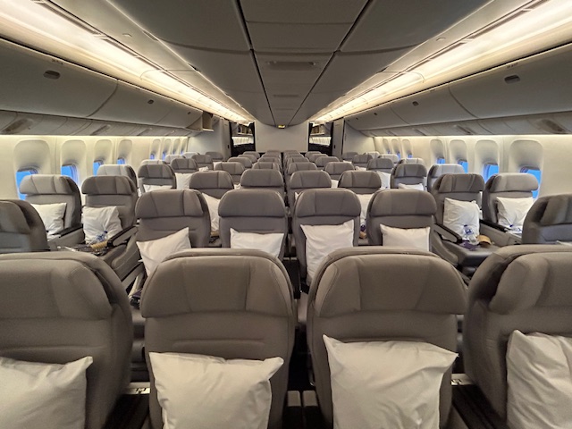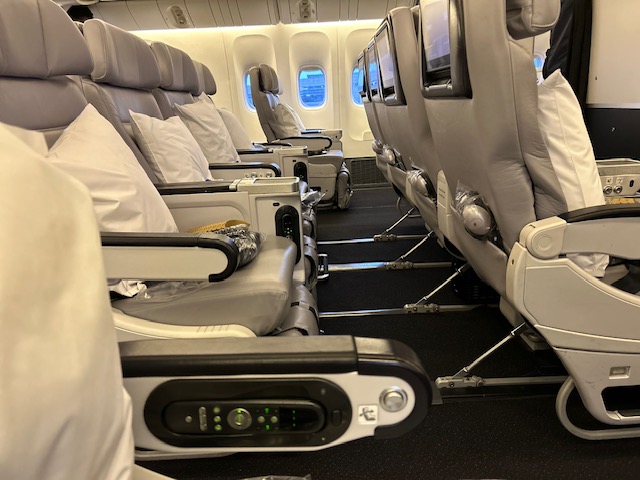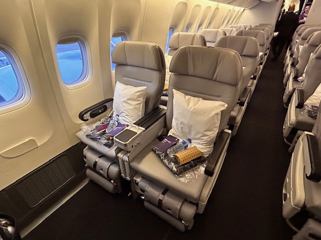 In Singapore sollte man nach der Passkontrolle rechtzeitig zum Gate aufbrechen. Die Handgepäck-Kontrolle erfolgt dort individuell und erfordert bei Betrieb entsprechend Geduld. Das Timing ist heute ein richtig gutes, direkt nach dem Screening geht es als einer der ersten von über 300 Gästen in die Boeing 777-300er (extanded range). Die Premium Eco bietet viel Platz, der Overhead Locker ist noch komplett leer für die 2 Handgepäckstücke. Die Sicht aufs Vorfeld und die Abwicklung der Maschine macht jedem Flug-Enthusiasten viel Spaß. Am Sitz findet sich eine Art „Kulturbeutel“, der aus einer nachhaltigen Kartonage hergestellt ist. Er beinhaltet neben einer Zahnbürste, die Zahnpasta, ein paar bunte Socken, einen Stift, eine Feuchtigkeitscreme sowie Ohrstöpsel. Für Nachtflüge ist es immer angenehm wenn man auf eine Augenklappe zurückgreifen kann, diese hinterlegt die Airline allerdings in der Galley. Mit 20 Minuten Verspätung geht es los, nach dem Take-off wird ein Erfrischungstuch gereicht, eine erste Runde Getränke u.a. mit Weinen aus Neuseeland. Der Sitz selbst hat eine bis zu 23 cm veränderbare Rückenlehne, mit 104 cm Abstand zum Vordersitz ist man führend im Segment und die Breite wird mit 49 cm angegeben. Die Kopfstütze ist auf die Körpergröße justierbar und der Sitz bietet eine Fußablage. Ein wirkliche gutes Produkt als solches, nur schlafen tut man schlussendlich nur oder besser in der Horizontalen. Wenn man zurück schaut ist der Sitz im Abgleich zu 1999 auf dem damaligen Buiness Class Niveau angekommen. Eine positive Entwicklung die sich nicht mehr aufhalten lässt und dazu führt, dass die Business ebenfalls einen Sprung nach vorn gemacht hat und Airlines die First schon teilweise abgeschafft haben. Somit ist die Premium Economy ein wirkliches gutes, ja sehr populäres Produkt geworden und hat sich durchgesetzt.