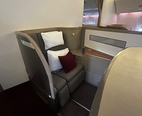 Von der Pier Lounge sind es gerade einmal 3 Minuten zum Abfluggate, dort ist alles sehr geordnet und nach dem Start zum Boarding verläuft es auch entsprechend flüssig und der Reihe nach ab. Was heißt eigentlich der Reihe nach? Ein Flugzeug wird immer nach Prioritäten und Klassen bestiegen. Zuerst kommen in der Regel Familien mit Kindern und älteren Menschen. Als nächstes sind es die hochrangigen Statusinhaber, die unabhängig von der Klasse nun das Privileg haben zu boarden, neben den First und Business Class Passagieren. Da es auf diesem Flug keine First gibt, allerdings sind die Sitze hierfür vorhanden, habe ich mich beim checkin-in für einen dieser erkundigt und den Fensterplatz 2k bekommen. Trotzdem schaue ich mir das kleine Compartment der Business Class direkt hinter den First Sitzen an, bei dem die Sitze im 1-2-1 angeordnet sind. Auch dieses Produkt das seit Jahren fliegt ist Weltklasse, bieten viel privaten Raum, einen ausreichend großen Bildschirm und lassen sich in ein komplett flaches Bett verwandeln, ideal für Langstreckenflüge mit Niveau.