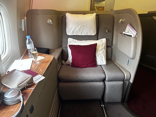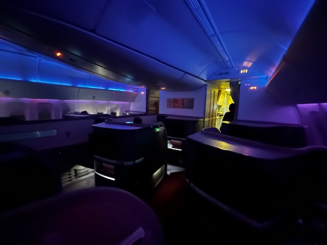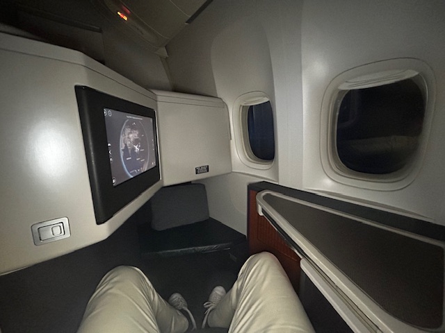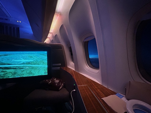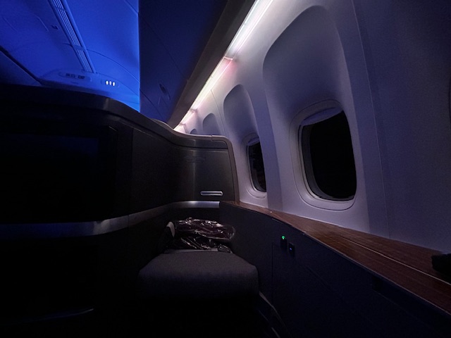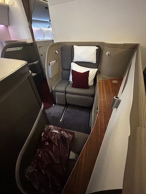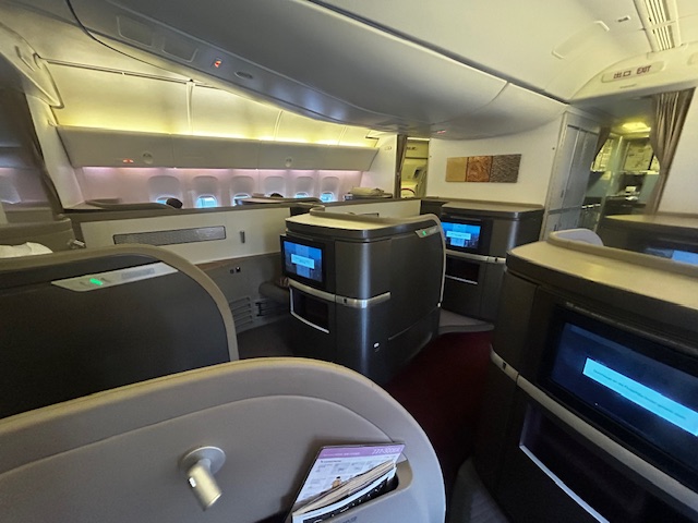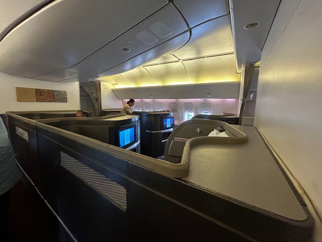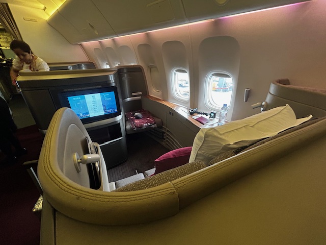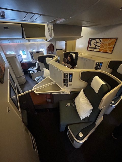 Von der Pier Lounge sind es gerade einmal 3 Minuten zum Abfluggate, dort ist alles sehr geordnet und nach dem Start zum Boarding verläuft es auch entsprechend flüssig und der Reihe nach ab. Was heißt eigentlich der Reihe nach? Ein Flugzeug wird immer nach Prioritäten und Klassen bestiegen. Zuerst kommen in der Regel Familien mit Kindern und älteren Menschen. Als nächstes sind es die hochrangigen Statusinhaber, die unabhängig von der Klasse nun das Privileg haben zu boarden, neben den First und Business Class Passagieren. Da es auf diesem Flug keine First gibt, allerdings sind die Sitze hierfür vorhanden, habe ich mich beim checkin-in für einen dieser erkundigt und den Fensterplatz 2k bekommen. Trotzdem schaue ich mir das kleine Compartment der Business Class direkt hinter den First Sitzen an, bei dem die Sitze im 1-2-1 angeordnet sind. Auch dieses Produkt das seit Jahren fliegt ist Weltklasse, bieten viel privaten Raum, einen ausreichend großen Bildschirm und lassen sich in ein komplett flaches Bett verwandeln, ideal für Langstreckenflüge mit Niveau.