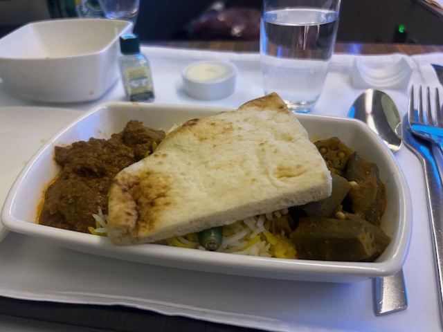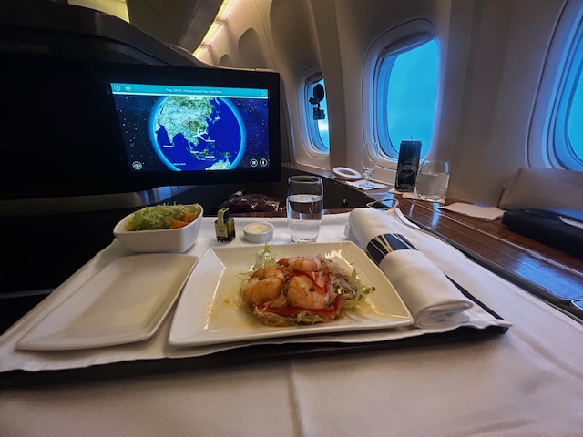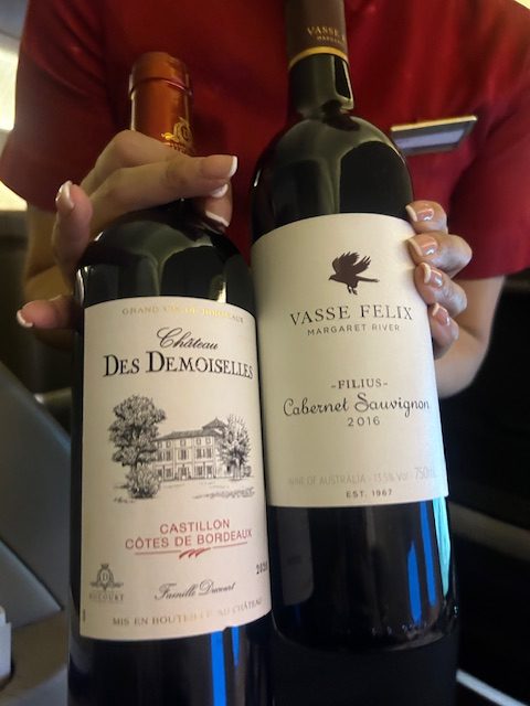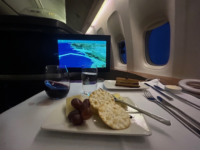 Die Crew empfängt mich maximal persönlich und gut gelaunt. Die Purserin ist aus Japan und begrüßt persönlich am Sitz. Als Aperitif perlt der Non-Vintage Thienot Champagner brilliant und klar im Glas. Genauso wie das Mineralwasser, aber selbstverständlich nicht so neutral. Die Gopro hängt startklar am Fenster, der Blick geht in Richtung Vorfeld Action, welche bei jedem Aviation Fan das Herz höher schlagen lässt. Als die Reiseflughöhe erreicht ist, entscheide ich mich für die Garnelen mit Gemüse-Salat, die schön angerichtet auf einem kleinen Teller serviert werden. Allerdings enttäuscht der Geschmack, er erinnert eher an einen touch Spülmittel, entsprechend geht der Großteil hiervon zurück. Das indische Lammcurry mit Naan Brot weiß auch nicht so wirklich zu überzeugen-leider. Die Konsistenz ist noch zu hart gekocht, eher etwas zäh, die dazu servierten Okraschoten könnten ein wenig mehr Gewürz vertragen, der Reis ist aber locker leicht und körnig, nicht verklebt. Als Dessert fällt die Entscheidung auf eine kleine Käseauswahl und einen sehr guten australischen Cabernet Sauvignon, Jahrgang 2016 vom Weingut Vasse Felix. Beerige Aromen, tief dunkel Farbe, etwas an Tanninen passt dieser perfekt als gelungener Abschluss.
