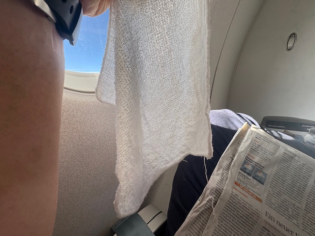 Der Start in Düsseldorf an einem Freitagabend ist ein entspannter. Mit einer Embraer Maschine geht es auf 1A nach Helsinki. Die Junker Lounge hat zugegeben schon bessere Abende erlebt, nach einem Bier ist schon Boarding Time. Dort angekommen ist der Weg kurz „in die Röhre“, sprich es ist ein „durchlaufen“ und als erster Passagier den Flieger zu betreten ist immer nice. Zu meiner Überraschung gibt es vorab ein heißes Tuch, dies ist normalerweise nur auf Langstrecken Standard-toll! Ebenfalls wird eine Flasche Wasser gereicht.