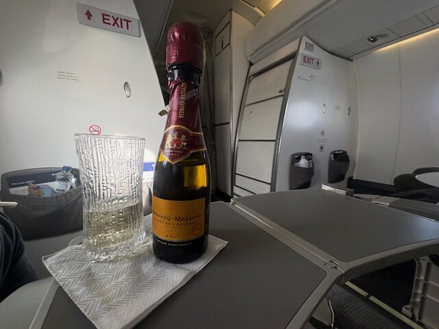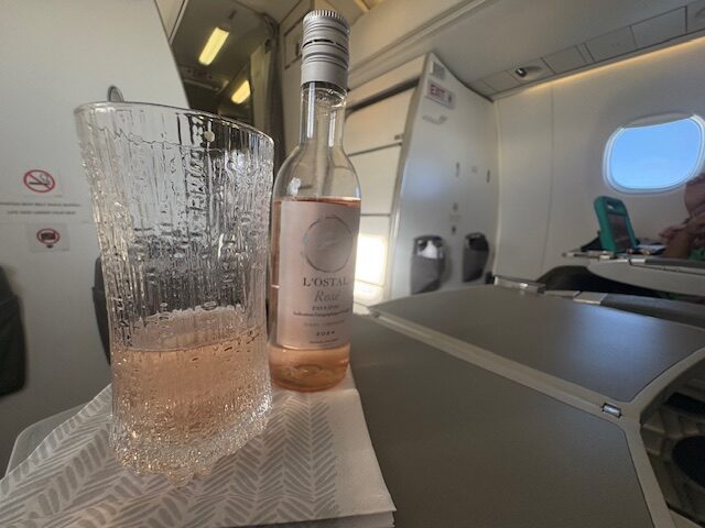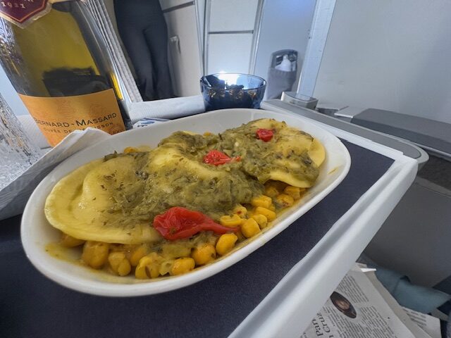 2 Scheiben Hähnchenbrust, welche in Panko gewälzt wurden und auf einem nordic style Krautsalat angerichtet sind, reißt niemanden unbedingt vom Hocker. Die vor dem Abflug ausgewählten Ravioli auf Maisgemüse sind durchaus lecker und gut in ihrer Konsistenz. Der Service ist präsent und zuvorkommend, zur Auswahl stehen diverse Weine, welche alle im Plastik-Flaschen-Format daherkommen. Champagner ist nicht, aber da befindet man sich schließlich in guter Gesellschaft, am europäischen Himmel. Spontan fallen mir in der Champagner League nur Air France, British Airways und Swiss ein.