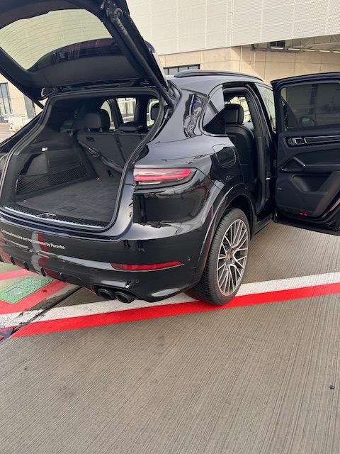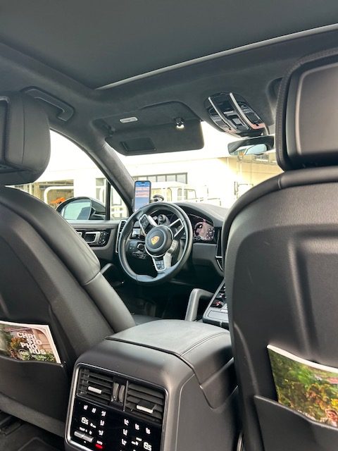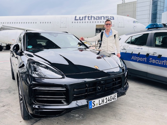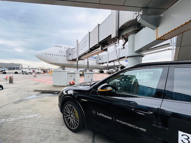 Erfolgt auf Weltklasse Niveau. Die PA holt einen am Tisch oder Sessel ab, man fährt eine Etage tiefer und schon sitzt man in seinem Auto. Diesmal ein Cayenne, welcher mich auch von meinem Flieger beim Aussteigen aus Düsseldorf ankommend abgeholt hat. Einige Minuten später steht man auf dem Rollfeld neben der majestätischen Boeing 747-8, beeindruckend!