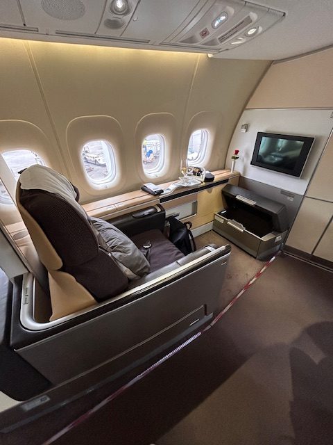 Ist dann nicht mehr so wirklich beeindruckend! Vor den Piloten zu sitzen auf 1A ist es noch, weil die 747 einfach eine Ikone ist. Mit ein wenig Phantasie schaut man hier sogar um die Nase herum, ja sprichwörtlich geradeaus anstatt nur nach links hinunter.