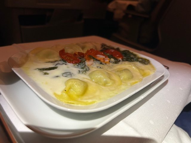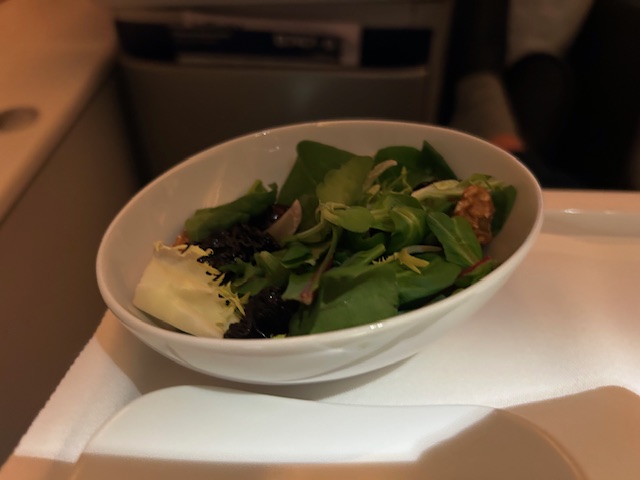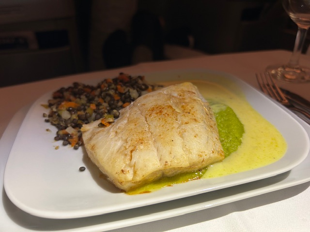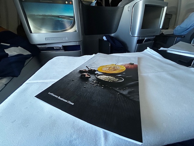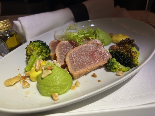 Zu Beginn zeichnen sich erste Schwächen ab, die selbst die beste Crew der Welt nicht auffangen kann. Auf der Internet Speisekarte wird ein NV Lanson Champagner Black Label kommuniziert, was man dann an Bord erhält ist eher Preiseinstieg, der Heidsieck Monopole NV. Online wird bei Lufthansa immer von exklusiven Weinen gesprochen, was ausgeschenkt und in weiten Teilen eher Realität ist, sind Weine aus dem Bereich von 6-8 Euro netto. Das kann bei aller Einkaufssynergie kein Premium Tropfen sein, hier bleibt LH sich leider treu und agiert eher auf Discounter Niveau und im Sinne des Shareholder Value Ansatzes. Die Vorspeise das Tuna Tataki mit etwas Brokkoli, Kichererbsen Püree mundet. Im Hauptgang gibt es Zander der eher moorig/erdig schmeckt obwohl er ein Weissfischfilet bekannt ist. Worauf ist dies zurückzuführen? In der Aquakultur Haltung werden leider zu oft Abstriche bezüglich Fischanteil und Frischwasser gemacht da kostenintensiv. Man steigert die Produktivität aber nicht die Qualität, es leidet das finale Produkt und somit die Gast-Experience! Es ist um ehrlich zu sein wenig apptetitlich und erinnert an negative Berichte aus der norwegischen Lachszucht. Auquakultur kann sicherlich ein Lösungsansatz sein in der Versorgung der Welt, aber nicht auf dem Level! Wo wir schonmal bei den LH Hauptgängen sind, diese sehen seit 20 Jahren so gut wie immer gleich aus. Ähnlich bis gleich angerichtet, immer wieder der Gulasch, eine Hähnchenbrust oder ein Pasta-Gericht und alles zentral in einer Fabrik gekocht. Das ist durchaus normal und in Ordnung, nur der Unterschied zu anderen Airlines ist, dass die Gerichte nicht noch in der Flugzeug-Galley finalisiert werden und darüber hinaus beim Wareneinsatz gespart wird. Dies lässt weniger Individualität, Frische und Gewürze zu und so mancher kreative Flugbegleiter kann es somit auch nicht auf Restaurant-Niveau heben. Bei Lufthansa wird der Teller am Fließband komplett angerichtet, tiefgekühlt und später nur noch im Ofen als Einheit erhitzt. Auftauflüssigkeiten vom Gemüse zum Beispiel, läuft direkt in die gebundene Soße, viele Komponenten sind in ihrer Stufe leider recht weit gegart und in Summe ist es dann ein Produkt, welches nicht in der oberen Liga mitspielen kann. Da mögen vermeintliche Luxus-Schlagwörter wie Trüffel, Belugalinsen, Edelschimmelkäse oder Entenbrust noch so „upmarket“ im Ohr klingeln, es sind leider nur und ausschließlich die Einstiegsprodukte ihrer Zunft. Das ist in der Kategorie Premium irgendwie auch zu wenig, um Glaubwürdigkeit auszustrahlen.
