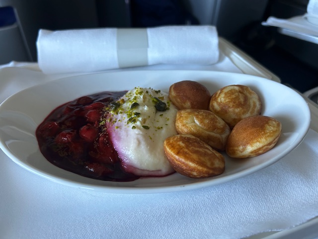 Vor der Landung steht unter anderem ein Griesbrei mit Pofferties zur Auswahl, dass sind kleine Pfannkuchen die locker leicht und zu meiner Überraschung wirklich gut umgesetzt wurden. Der Grießbrei ist cremig, in seiner Konsistenz wirklich gut, allerdings mit „Instantflocken“ hergestellt. Dabei bleibt oft der urige, getreidige und originale Geschmack von Grieß auf der Strecke. Trotzdem ist es unter dem Strich solide! Alternativ gibt es ein Rührei mit Süßkartoffelragout oder die Joghurt Bowl mit Cranberrys und Walnüssen.