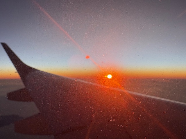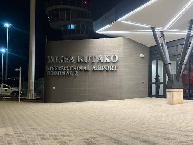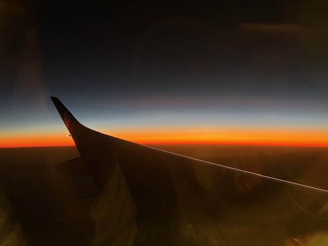 Mit 1:52 Stunde ist der Flug voll im Zeitplan, im Westen flankiert ein phantastischer Sonnenuntergang, und der Jet landet pünktlich in Windhoek! Die Einreise ist schnell und effizient erledigt ohne jegliche Wartezeiten, der Koffer läuft schon auf dem Gepäckband und wartet auf die Abholung.