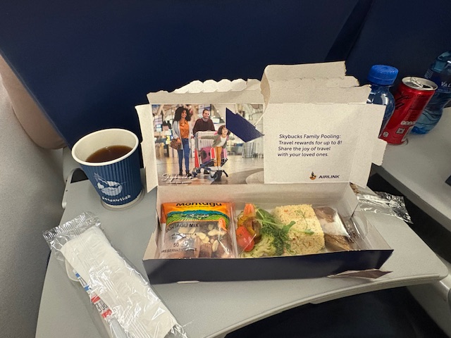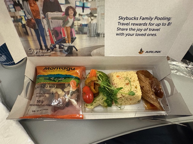 Es findet sogar ein Inflight Service statt!Ja richtig und er ist unterteilt in 1.(Getränke)und 2.Service/Meal und erneute Getränke.Das Essen kommt in einer bunt designten box und beinhaltet einen Cous-Cous-Salat, gegrillte Gemüse und eine vegane aufgeschnittene Wurst. Dazu serviert man eine Tüte Studentenfutter, welche doch Kindheitserinnerungen weckt.