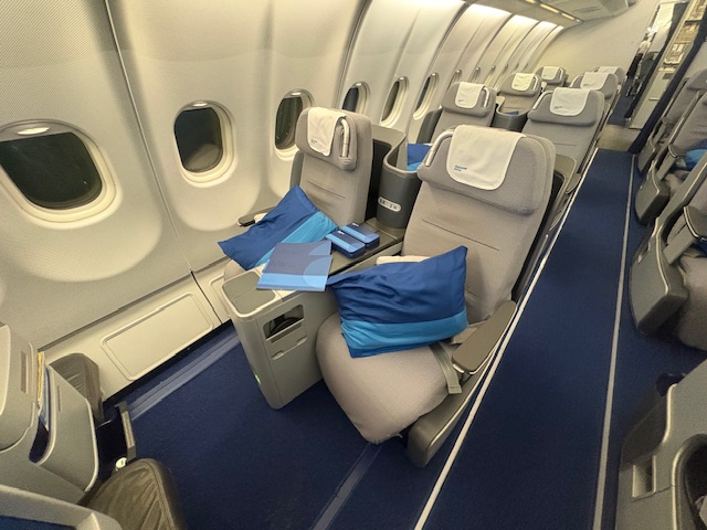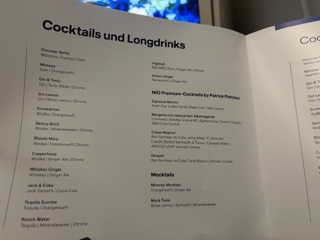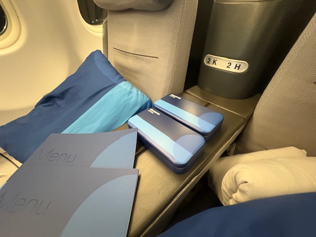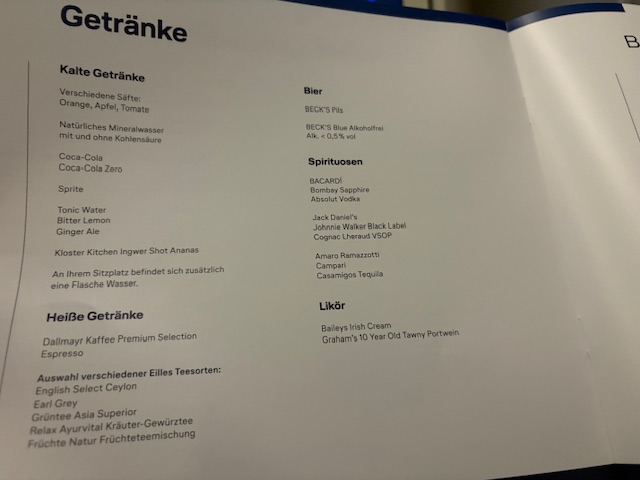 ……beginnt pünktlich um 20:00 Uhr. Die Maschine welche aus München morgens gegen 8:00 Uhr gelandet war, ist über einen kurzen Weg über das Rollfeld zu Fuss erreichbar. Es ist immer ein wenig gemütlicher als erster Passagier einzusteigen, wenn man noch die ganze Kabine für sich hat. Die Sitze sind 1 K und 1 H. Dies ist gerade bei einem Nachtflug zu bevorzugen, da der Service schneller an einem vorbei zieht und es früher „ins Bett“ geht. Dieser Sitz lässt sich in eine komplett flache Position bringen, ein dickes Kissen und eine Decke sorgen für ein wenig mehr an Komfort. Vor dem Abflug um 20:50 gibt es einen Welcome Drink, zur Auswahl steht ein Rheingau Sekt und ein exotischer alkoholfreier Fruchtcocktail, der sehr gut schmeckt.