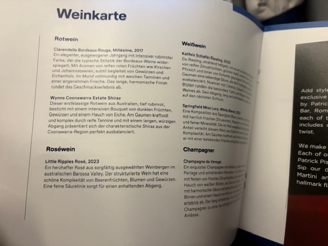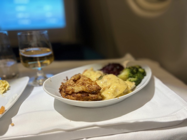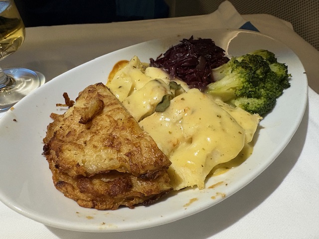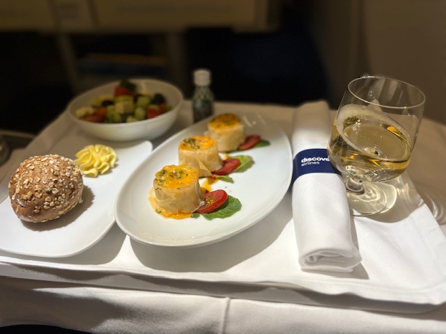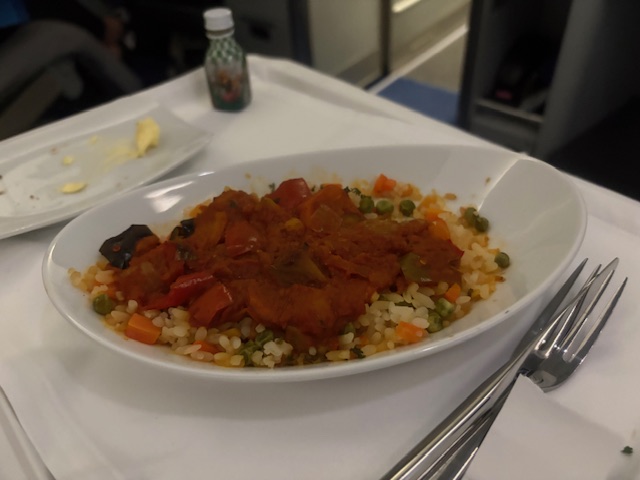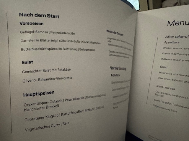 Nach dem Start, es dauert wieder knapp eine Stunde bevor die 2.Getränkerunde startet, kann der Passagier zwischen 3 Vorspeisen, einem Salat und 3 Hauptgängen wählen. Die Garnelen im Blätterteig sind schön angerichtet und schmecken mit der Sweet-Chili-Sauce und den Cocktailtomaten sehr gut. Im Hauptgang fällt die Wahl auf den gebratenen Kingklip (Fisch) mit Kartoffelpuffern und Rotkohl (!) sowie recht weich gekochten Brokkoli. Warum hier ein Rotkohl gereicht wird ist mir nicht ganz klar, aber er schmeckt! Positiv anzumerken ist, wie man in Namibia einer so exotischen Location, überhaupt 2 große Flieger becatern kann. Dies ist mit einfacher Infrastruktur, hohen Hygieneanforderungen an einen Langstreckenflug, eine sehr gute Leistung!