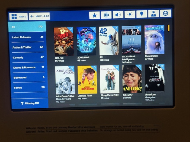 Am besten schmeckt meiner Meinung dazu ein guter Wein aus der Champagne und zwar aus dem Hause devenoge. Der Tropfen kommt in 11000 Metern Höhe mit nussigen und leicht Honig-artigen Aromen am Gaumen an, ist vielleicht 2-3 Grad zu warm serviert, aber eine gute Wahl im Lufthansa Kosmos. Zum abschließenden Käse gesellt sich noch ein Glas Shiraz aus dem Hause Wynns in Australien, bevor es in die Waagerechte geht. Wer möchte macht sich mit den Inhalten aus dem Amenity Kid noch vorher frisch, zieht seine Augenklappe und die Ohrstöpsel an und schläft durch bis der Flieger Deutschland erreicht. Zwischendurch wird man eigentlich nur durch einige Turbulenzen geweckt und pünktlich um 6:40 landet der A 330 auf dem Rollfeld in München. Beim Entertainment ist es dann wie auf dem Hinflug und für eine Business Class einfach zu wenig, gerade im internationalen Vergleich.