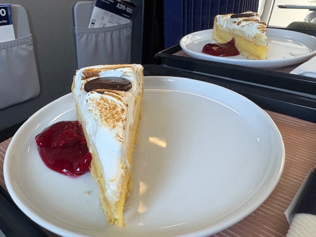 Der Bodenservice an diesem Samstag ist durchweg gut und maximal effizient, sowohl am Abflughafen Düsseldorf als auch beim Umsteigen in München. Auf dem Inlandsflug gibt es eine leckere Meringue Lemon Tarte und ein Glas Sekt von Georg Breuer aus dem Rheingau. Eine schöne Kombination, die Torte schmeckt und der Sekt ist durchaus eine Steigerung zu den früheren Schaumweinen, die man bei LH in Business serviert bekam.