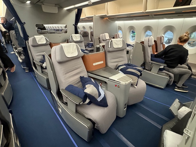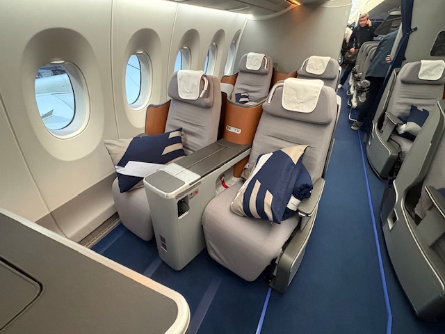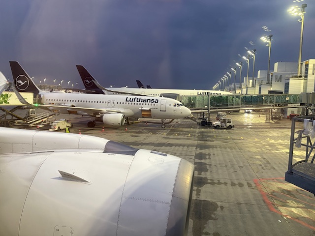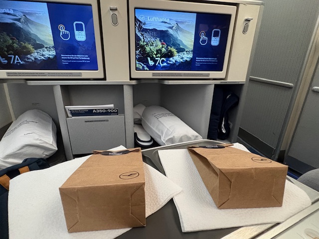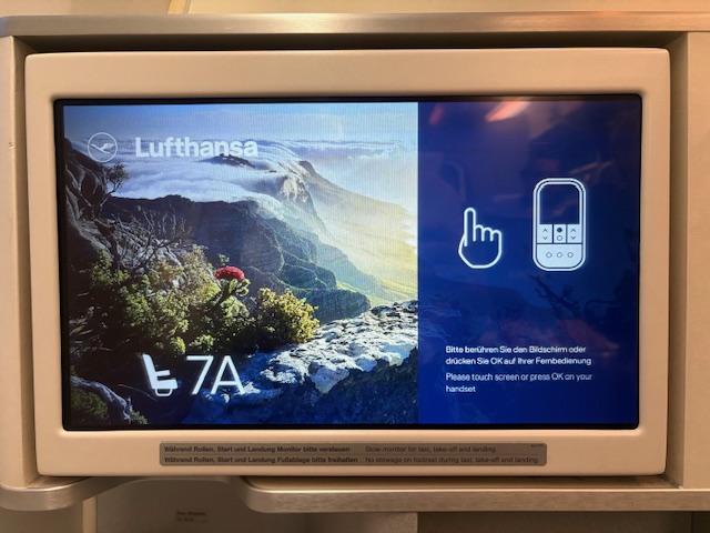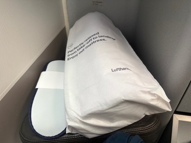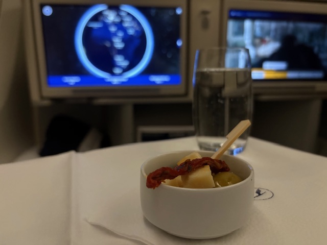Der Flug verläuft weitgehend ruhig, der Sitz lässt sich zu einem flachen Bett mit matratzenähnlicher Unterlage ausfahren, die Decke und ein bequemes Kissen sind von guter Qualität. Ein kleiner „Kulturbeutel“ im Porsche Design kommt stylish daher und beinhaltet die nötigen Nacht-Utensilien von der Zahnbürste bis zur Augenklappe. Mit der Sitzreihe 7 befindet sich der allgemeine Fluggast leider sehr nahe an den Toiletten und der Galley, dafür ist das Abteil mit nur 2 Reihen und einer Abtrennung zur Premium Economy recht klein. Bei einem Nachtflug kann das auch Vorteile haben. So muss man, wenn man in 7A am Fenster sitzt, über den Nachbarn klettern, um aussteigen zu können. Dies soll sich hoffentlich bis 2030(?) auf allen Flügen der Lufthansa ändern, es bleibt abzuwarten, ob diese Umstellung ggf. schneller oder noch früher erfolgt. Das Bordprodukt „Allegris“ wurde vor 8 Jahren angekündigt, die Umstellung läuft, Covid hin oder her, superlangsam. Die Fehler diesbezüglich sind größtenteils hausgemacht und man mogelt sich mit dem was man hat weiter durch.
