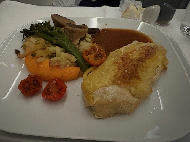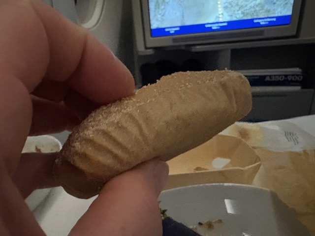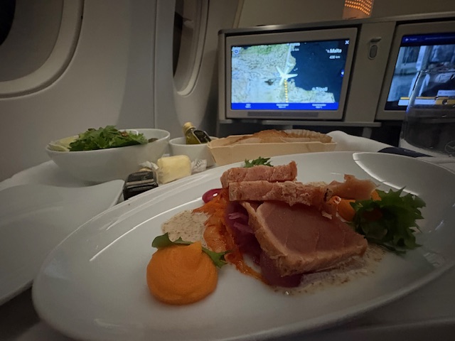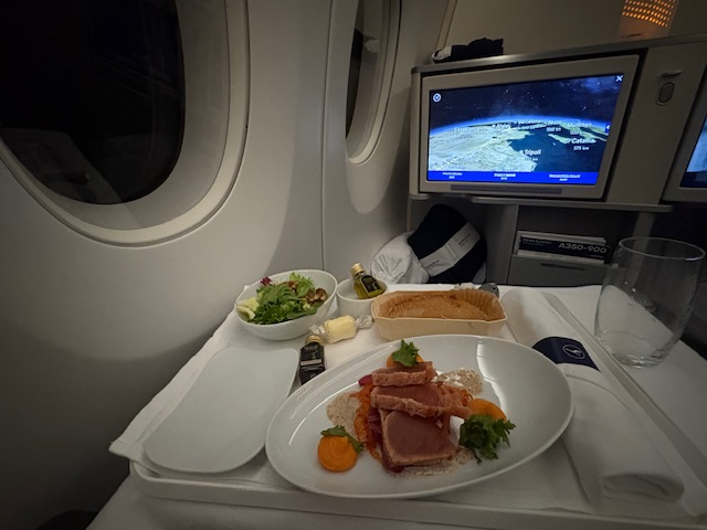 Vor dem Abflug kann man auf der Homepage der LH die Menükarten für seinen Flug einsehen und sich sein Wunschmenü aussuchen. Auch die verladenen Standardartikel sind hinterlegt und es kommt auch Jahre nach dem Zusammenbruch der Lieferketten zu Ausfällen. Die kommunizierte Rinder-Roulade ist nicht mehr verfügbar, der Sauvignon Blanc aus Neuseeland wurde nicht geladen und aus dem Kabeljau ist ein Zander geworden. Das Brot vom „Weltbäcker“ Axel Schmitt ist ein Flummi, kalt, ohne Kruste und insgesamt für die Kombination mit einem Aushängeschild nur zu bedauern. Da spricht man stolz von „Brotkultur“, die Richtung war sicher gut, die Ausführung ist dann eher peinlich. Das Thunfisch Tataki ist zugegebenermaßen etwas zäh, recht dick geschnitten, aber von der Umsetzung her in Ordnung und bei den Passagieren beliebt. Die servierte Maispoularde mit teilweise verkochtem Gemüse ist optisch etwas gräulich und das Gericht wirkt wenig appetitlich. Ein echter Lichtblick der Lufthansa Champagner Lotterie ist der 2013er Jahrgangschampagner von Lanson, den man selten in der Business Class der Lufthansa, aber auch anderer Fluggesellschaften gesehen hat.