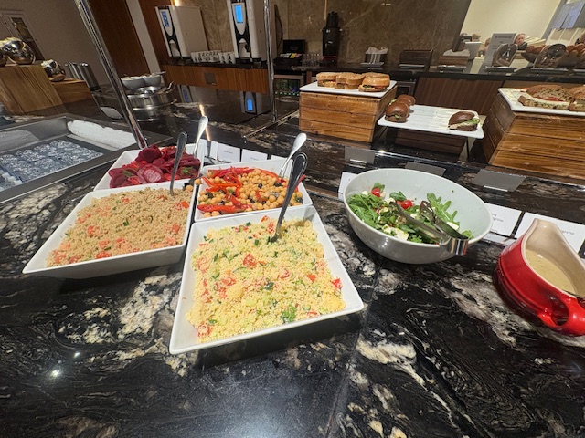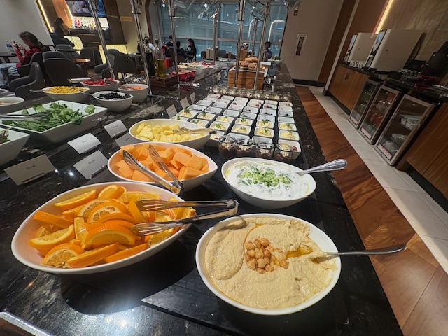 Die Essensauswahl ist entsprechend Turkish angehaucht und kommt im Buffetstyle attraktiv angerichtet daher. Viel frisches und geschältes Obst, Hummus, Salat mit diversen Toppings, Couscous und auch Sandwiches stehen zur Wahl. An der Bar werden die alkoholischen Getränke ausgegeben, von Gin Tonic über Aperol Spritz oder einem Glas Wein. Leider fehlen der Lounge ein paar Stromanschlüsse am Sitz für die moderne und mobile Gesellschaft. Das Duschzimmer hingegen ist, obwohl auch schon ein paar Jahre alt, grosszügig und hält eine willkommene Erfrischung parat nach einem langen Tag bei mehr als 25 Grad.