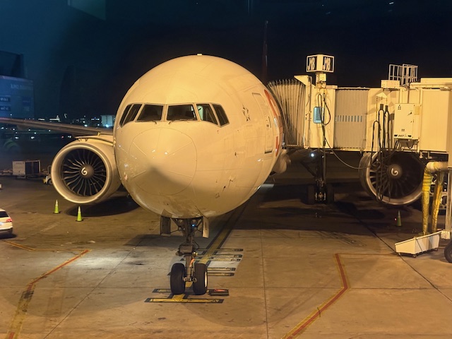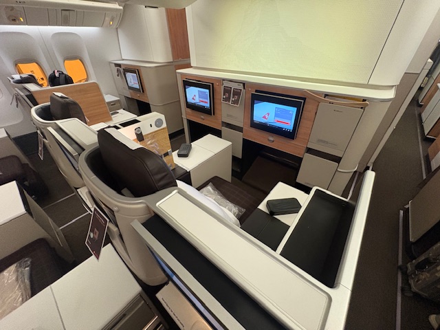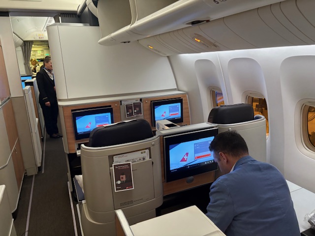 Verläuft leider mit etwas Verzögerung. Die Crew war anscheinend im Stau und wo keine Piloten da auch kein take-off. Mit gut 30 Minuten delay geht es dann an Bord, der Flieger ist gut gebucht und die Boeing 777 hat ähnlich wie der A 330 ein „Stübli“, also eine kleine Sektion an Sitzen direkt hinter der First Class udn vor der Galley. Da der Flugzeugrumpf doch um einiges breiter als beim Airbus ist, bietet sich auch in der Sitzanordnung nebeneinander etwas mehr an Bewegungsraum. Auch wenn man bis heute bei einem Nachflug am Fenster sitzend über den Fluggast am Gang drüber steigen muss, ist dies doch um einiges angenehmer als im A 330. Hinzu kommt der sogeannte Bulkhead-Sitz, welcher direkt vor der Trennwand zur First Class positioniert ist, was deutlich mehr an Fußraum in der Liegeposition ermöglicht.