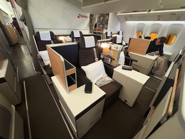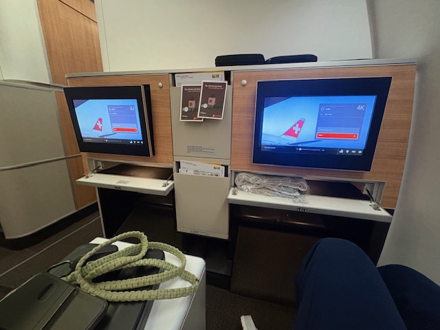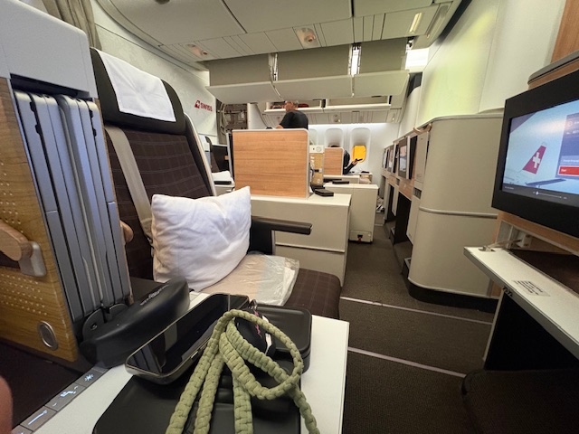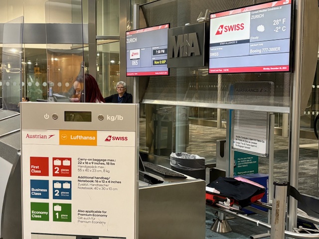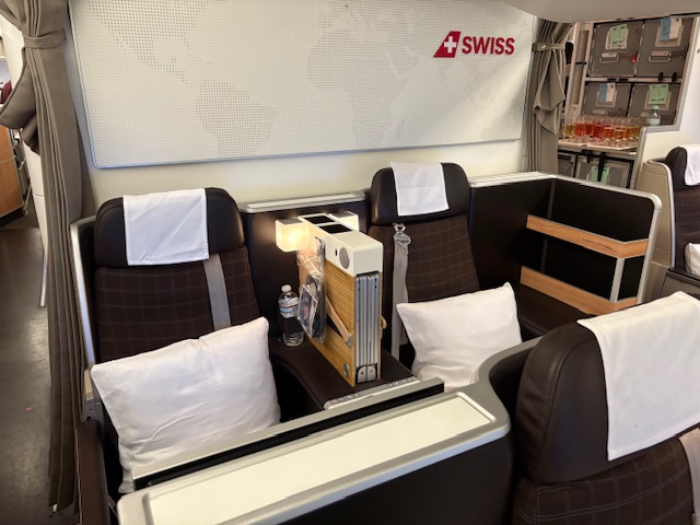 ….mit der schweizer National-Airline Swiss (LX) findet in der Business Class statt. Das Fluggerät ist eine Boeing 777-300er mit bis zu 320 Passagieren. Die Konfiguration teilt sich in 8 First Class, 62 Business, 24 Premium- und 226 Economy Sitze ein. Dabei sind 10 Business Class Sitze im sogenannten „Stübli“, also einer viel kleineren Einheit angeordnet, die restlichen 52 dieser Reiseklasse sind hinter der 2.Eingangstür verbaut worden. Zudem genießt man auf 4 J und K mehr Beinfreiheit durch den sogenannten „bulkhead“. Da vor diesen Sitzen die Abtrennung zur First Class sich befindet, ergibt sich keine Reduzierung in der Beinfreiheit. Da es sich um einen Nachtflug handelt, die Maschine verlässt das Gate in Miami gegen 21:00 Uhr, ist ein wenig mehr Platz und die Möglichkeit zusammen zu sitzen sehr willkommen.