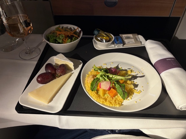 Als Willkommensgetränk gibt es ein Glas vom guten Jacquart Champagner, non-vintage und die Menükarten werden ausgeteilt. Ist erstmal die Flughöhe erreicht geht es auch schon mit dem Abendessen los. Wenn man gegen 22:00 über dem Atlantik ist möchte der allgemeine Fluggast dann auch nicht mehr lange warten. Die Swiss bietet als Vorspeise entweder eine geräucherte Entenbrust mit grünen Bohnen an, meine Entscheidung ist der Couscous-Salat mit Minz-Limetten-Dressing und Butternutkürbis. Dazu empfehle ich den Cuveé aus der Champagne oder den gut schmeckenden 2023er Eau de Provence, also einen Rosé Wein. Weitere Optionen sind ein vor Holz strotzender Chardonnay aus dem Columbia Valley oder der Terra Joya aus dem Valais.