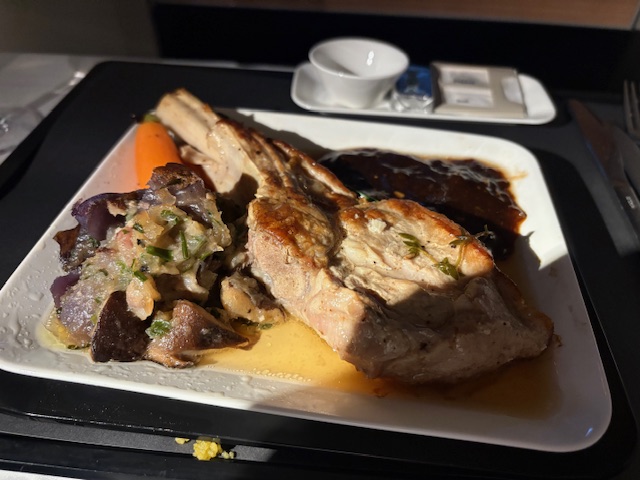Der Hauptgang liest sich zumindest in der Speisekarte als gewagt. Ein kurzgebratenes Kalbskotlett mit Thymian-Demi-Glace, Kartoffel-Waldpilz-Ragout mit Speck, Karotten und Baby-Zucchetti. Warum gewagt fragt sich der allgemeine Leser vielleicht? Wer ein Stück vom Kalb am Knochen serviert, der weiß das die Kalibrierung, sprich die Größe eigentlich nur schwer auf den Teller passt. Das mag beim Kalb noch gehen, ist allerdings von der optischen Proportion mit dem Knochen etwas gewöhnungsbedürftig, aber auch für dieses Restaurant-Segment mal innovativ. Wie fast alle Produkte in der Luft ist es auch gut durchgegart, dass ist in gewisser Weise auch nachvollziehbar, weil die Produktsicherheit in diesen Sphären die Maxime schlechthin ist und auch sein muss. Als Weinbegleitung passt ebenfalls der Rose aus der Provence, auch wenn der rote Traubensaft aus dem Bordeaux, dem Chateau Faugéres 2016, durchaus ein Jahrgang ist der richtig temperiert zu überzeugen weiß. Desweiteren komplementiert das Gut „Hess“ von der Nordküste in Kalifornien mit einem Cabernet Sauvignon, sowie ein Schweizer Tropfen die Karte.