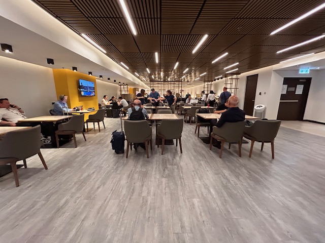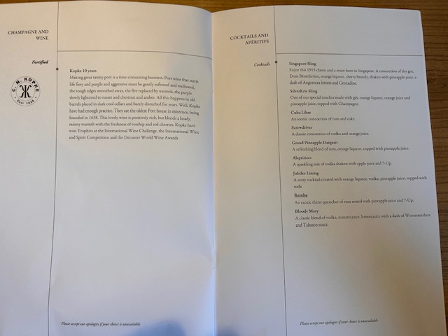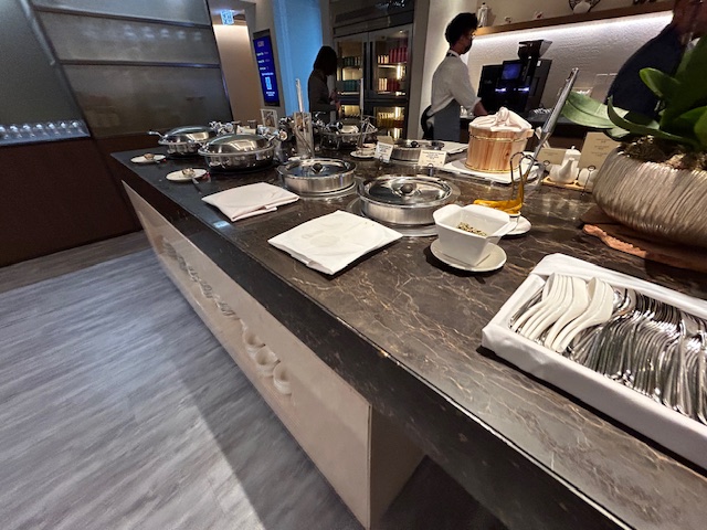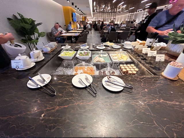 Ist klassisch nach dem SQ Stil around the world gestaltet, große Ear-Sessel wechseln sich ab mit dem Essbereich, dem Büffet und der Bar. Apropos Food & Beverage, hier scheint es mir das der Rotstift angesetzt worden ist. Aus den Silverkris Lounges kenne ich eigentlich das Angebot etwas hochwertiger. Woran mir das auffällt? Ich bin der Meinung das französischer Schaumwein immer ein fester Bestandteil des SQ Konzeptes war, er ist durch einen Prosecco substituiert worden-leider! Die angebotenen Weine sind geschmacklich eher im von mir so gern herangezogenen 5 Euro Netto-Bereich, man muss es so leider sagen, eine Enttäuschung. Da erwartet man von SQ deutlich mehr. Die Speisen im kalt-warmen Büffet sind in Ordnung, Dim Sums wechseln sich ab mit Sandwiches und anderen Kleinigkeiten wie einer Käseauswahl. Allerdings ein echtes Highlight findet sich hier aber auch nicht. Es ist die berühmte Ware von der Stange, entweder sind die Ansprüche über die Jahre und Reisen gestiegen oder es ist mal eine durchschnittliche Tagesleistung. Die Wahl fällt auf eine Coke und den so weltweit mit der Heimat der Airline assoziierten Singapore Sling. Das Boardmenü verspricht später deutlich mehr, die Vorauswahl fiel auf Rinder-Filet in Estragon Sauce, also vom Papier her schonmal gut! Das Internet ist langsam, die Kapazität eher am unteren Ende von „fast“ und so ist es der gute alte Anspruch, der den verwöhnten Vielreisende genau hinschauen lässt. ????