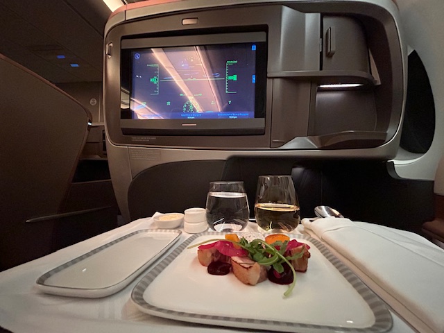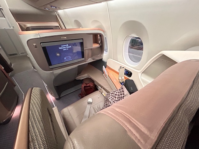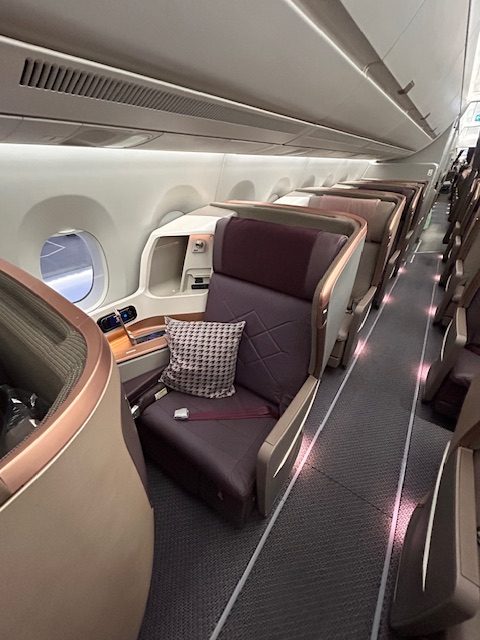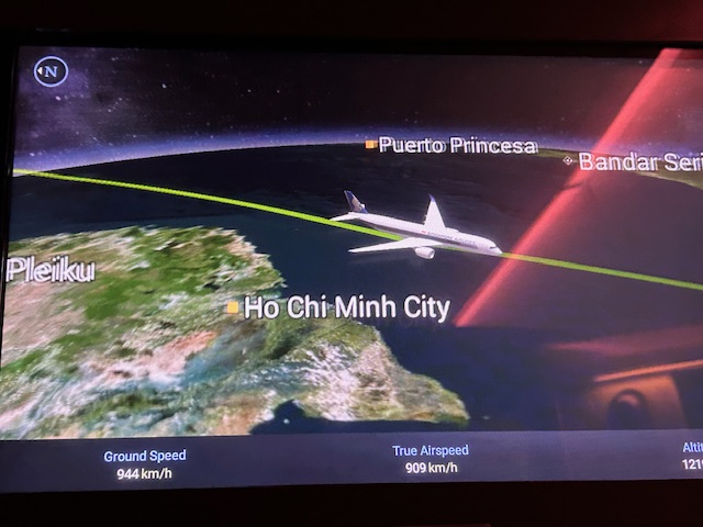 Gate24 ist innerhalb weniger Minuten erreicht, die 5 Sterne Airline hat ihren Boarding Prozess im Griff und so läuft es sich als erster in die Röhre. Sitz ist heute 12k da auf dem A 350-900 keine First angeboten wird und die Reihe 1 mit 11 beginnt. Beim einlaufen ist wie sonst üblich an der Tür niemand und so geht es halt auch ohne guidance direkt an den Sitz. Gewohnt freundlich und Service bereit startet die Experience nach diesem Fauxpas und wenn man ehrlich ist, für 3.5 Stunden braucht man eigentlich keinen dicken Sessel unter dem verwöhnten Wohlstands-Hintern. Denn dieser ist bei SQ gewohnt breit, bietet viel Ablagefläche, schlafen ist noch nicht angesagt ginge aber auch, somit heißt es eher aus dem Fenster schauen und den digitalen Flightpath auf dem Bildschirm genießen.