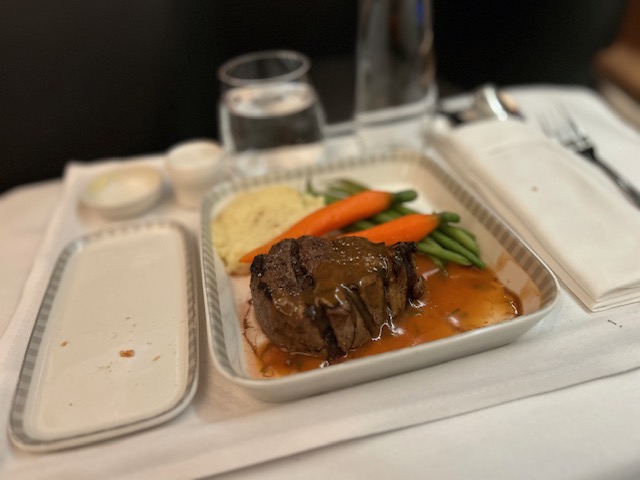 Im Anschluss folgt der Hauptgang, der vorab ausgewählt wurde aus dem SQ Programm „Book the Cook“. Ein Rinderfilet mit Kartoffelpüree, Babykarotten und recht hart gekochten Bohnen. Dazu eine Estragon Jus, welche doch ein wenig zu klar, glibberig und bedingt mundet. Spätestens nach dieser Formulierung gehört man selbst in die Schublade Schnösel oder Profi, dass kann sich jeder selbst aussuchen. ????