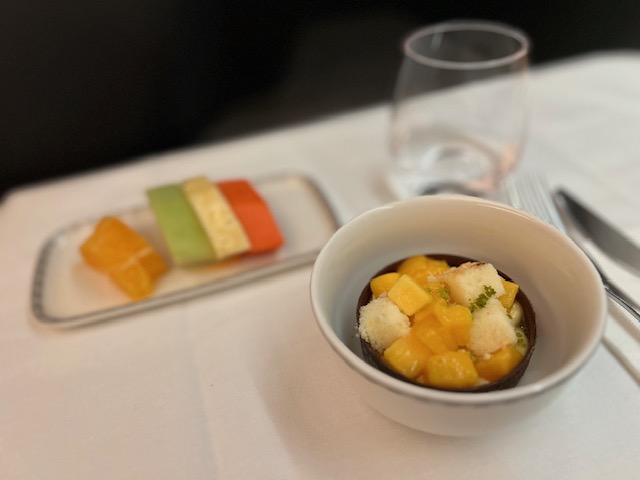 Das Dessert ist eine Schokoladen basierte Tarte mit Mangocreme, darauf dressiert ein wenig frisches Obst und weiße Toastbrotwürfel (Pound Cake) einfach und lecker. Dazu gesellt sich ein 16 Jahre alter Single Malt Whisky aus dem Hause Glen Deveron, sowie ein doppelter Espresso.