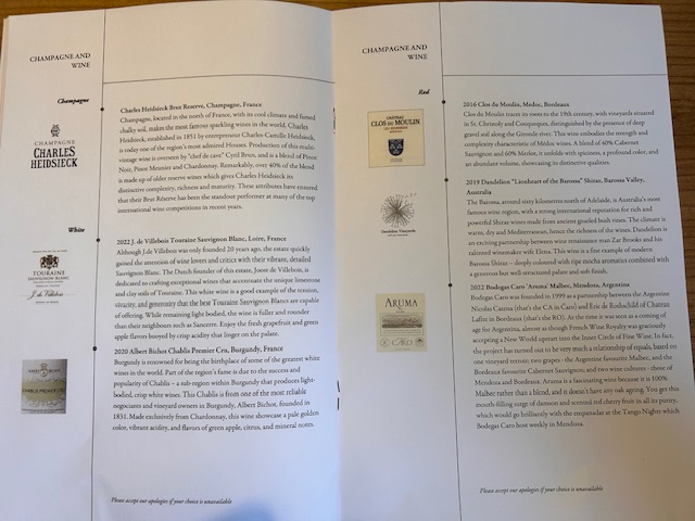 Die vorher studierte Weinauswahl erinnert ein wenig an die DLH Business Class, ohne alle zu probieren, ist bis auf den guten Charles Heidsieck Champagner, die Auswahl eher dem niedrigen bis mittleren Preissegement zuzuordnen. Verwunderlich, im vergangenen November nach Bali war dieses Angebot noch zu 100% aus dem Bereich „Premium“, somit stellt sich die Frage worin die Gründe für dieses doch relativ offensichtliche downgrade liegen?