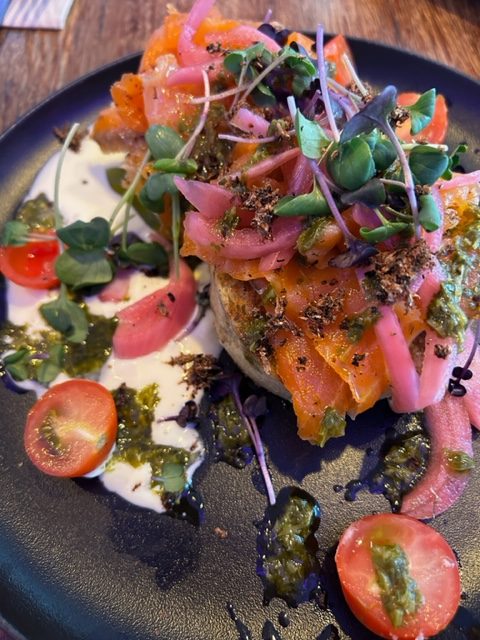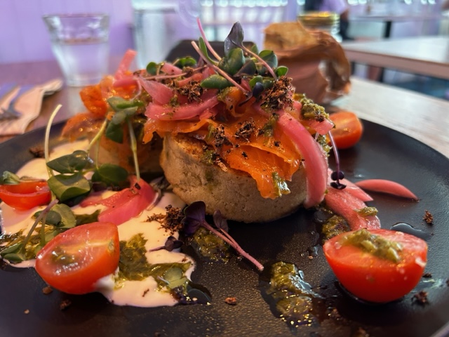 Das „All-Day-Breaky-Menu“ gibt alles her, nach was sich der kreative Gaumen sehnt. Von Porridge, über Eierspeisen, ab und an raffiniert gewürzt mit Ras el Hanout oder wie in meinem Fall, dass House-Cured-King-Salmon-Crumpet! Was ist eigentlich ein Crumpet? Einfach übersetzt ist es ein Fladen, auf dem ähnlich wie bei einem Brot belegt wird. In diesem Fall mit hausgebeizten Lachs. Begleitend dazu finden sich auf dem Teller eingelegt Zwiebeln, Creme Fraiche und die Wakame Alge. Die roten Kirschtomaten stellen ein farbliches Spiegelbild zum roten Lachs her. Das saftige grün der Kresse und des Korianders wirken farblich abgestimmt und frisch! Dazu wird Wasser gereicht, es sind aber auch selbstverständlich weitere Getränke wie zum Beispiel Smoothies oder hausgemachter Kombucha auf der Getränkekarte. Die Kaffee Spezialitäten kommen ausnahmslos aus einem Siebträger und in Barista Qualität zu Tisch.