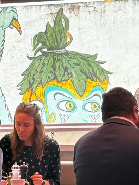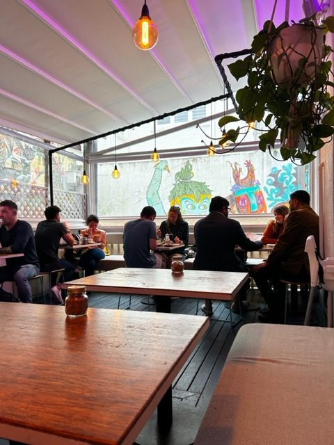 Das Ambiente ist lässig cool, man blickt in Teilen auf die umliegenden, mit Graffiti besprühten Hauswände. Der Service ist herzlich unaufgeregt und aufmerksam genug, um nicht vergessen zu werden.