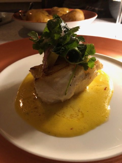 Für die Sauce die Schalotten-Würfel in etwas Butter anschwitzen. Mit Weißwein ablöschen, dann komplett reduzieren und mit dem Fischfond auffüllen. Wenn dies stark bis zur Blasenbildung eingekocht ist, die Sahne und die Safranfäden hinzugeben. Aufkochen und erneut reduzieren bis die Sauce eine gute Bindung erhält, passieren und mit etwas Zitronensaft, Salz, Pfeffer würzen. Die Butterwürfel einrühren, nicht mehr kochen lassen und die Sauce auf dem Teller zum Fisch anrichten.