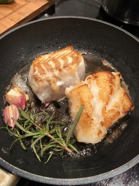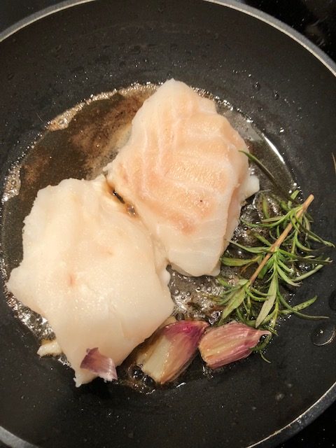 - Der Fisch: Pro Portion 220 g Kabeljau Loin – Salz und Pfeffer aus der Mühle – 15 g Pflanzenöl und 10 g Butter zum Braten – 1Zweig Rosmarin und 1 Knoblauchzehe sowie einen Spritzer Zitronensaft