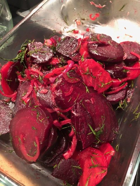 Zuerst die Rote Bete Knollen mit Schale im Backofen für ca. 20 Minuten bei 180 Grad garen. Mit einer Messerprobe bitte den Garpunkt kontrollieren. Je nach Knollenstärke kann der Garprozess länger dauern. Leicht abkühlen lassen, dann schälen und in Scheiben schneiden. Im Topf das Öl und die Butter schmelzen, den Kümmel bei moderater Hitze etwas ausdünsten lassen. Den Ingwer, die feinen Zwiebelstreifen hinzugeben, sobald die Zwiebel etwas gegart ist, die Rote Bete Scheiben damit und dem gehackten Rosmarin marinieren. Im Nachgang mit etwas Salz und Pfeffer abschmecken.