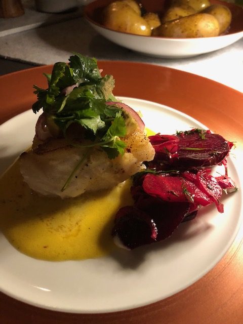 Für die Garnitur den gewaschenen Koriander mit der fein geschnittenen roten Zwiebel, dem Zitronensaft oder der gehackten afrikanischen Salzzitrone sowie dem Olivenöl marinieren. Den Fisch auf die Safran-Sauce setzen, mit dem Koriander garnieren und dazu die Rote Bete reichen. Als Sättigungsbeilage empfehle ich gekochte Kartoffeln.