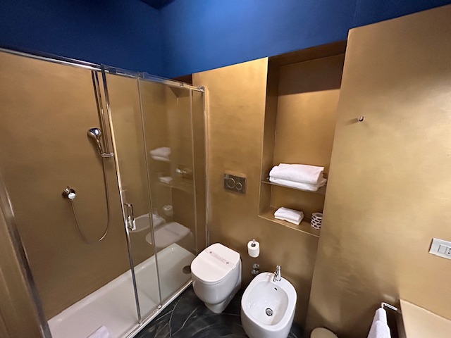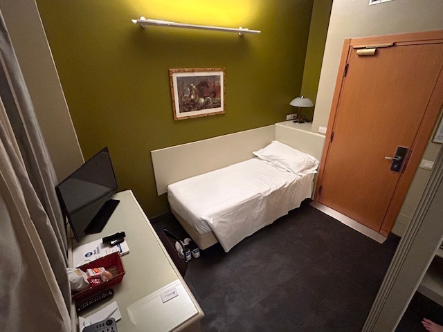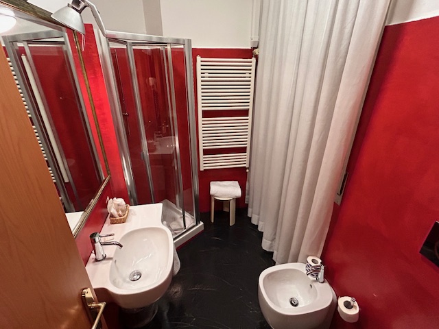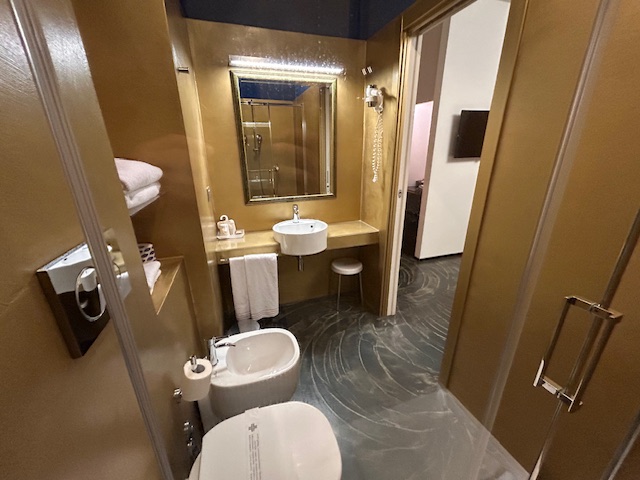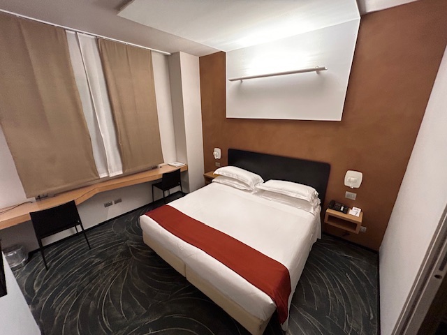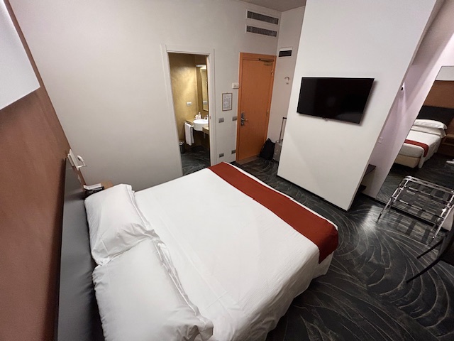 Die Ankunftszeit ist mit 22:00 Uhr noch gerade recht und der Checkin verläuft extrem effizient. Das Zimmer ist dann eher ein „hello-wach“ Erlebnis, direkt am Aufzug, ein Bett wenn man es so nennen darf, 90 cm breit, die Jugend lässt grüßen. Bei jeder Bewegung bewegt es sich noch, da auf Rollen. Es bestätigt sich mal wieder, Hotels in Italien sind in Teilen in den 90ern stehengeblieben, obwohl ich die 120 Euro als nicht unbedingt billig ansehe. Highlight ist, es gibt keinen Teppichboden mehr! Ja richtig, zudem ist die Dusche für ausgewachsene Männer eher auf dem Niveau der Kinderstube, somit passt das zum Bett. Tresor Fehlanzeige, die Heizung läuft massiv auf dem obersten Level, immerhin lässt sich die Tür abschließen. Nach einer Nacht ist Zimmerwechsel angesagt und der macht sich bezahlt. Walkin Dusche, großes Bad, Doppelbett und kein Aufzug zu hören – geht doch! Dafür ist die Einrichtung leider viel zu laut, Leitungen die wie zu römischen Zeiten Wasser transportieren, Türen die „scheppern“, an ruhige 100% Schlaf ist eher nicht zu denken. Der Empfangsbereich ist noch zeitgemäß, es gibt eine Art „Workingarea“ und im Keller findet sich der Frühstücksraum, guten Appetit.
